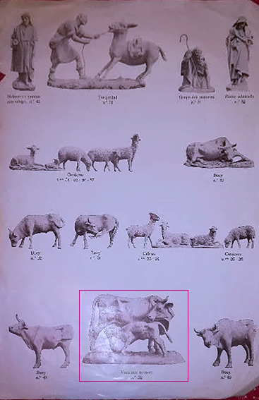 Com Vaca ternero VM ESC.jpg (139KB - 179 descargas)Empezamos por la última (de las enmarcadas) y la más reconocida de las figuras o grupo de figuras de animales del belén, `La vaca y el ternero´, naturalmente es una copia o `inspiración´ del reconocido molde de Salvador Masdeu (1864-1918), la fundación del taller El Sagrado Corazón como sabemos es en 1900 y la producción comenzaría en la primera década del siglo cuando ya Masdeu estaba en sus últimos años de su vida.
