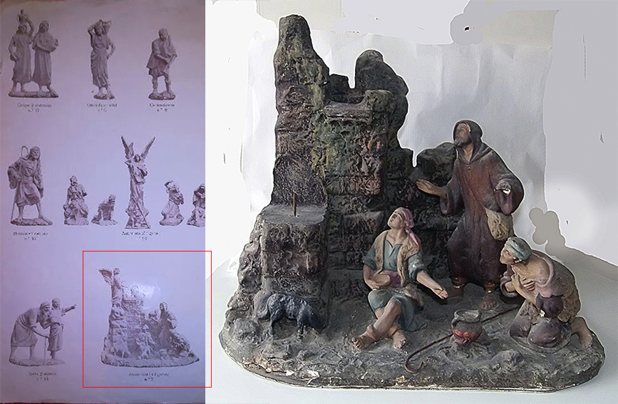 Antes de proseguir con las figuras enmarcadas (en rojo) y las averiguaciones...subo un ejemplo del buen hacer y la calidad del taller (principio de siglo XX), con un grupo de la anunciación a los pastores (en catálogo, como modelo n°7 Anunciata completa ), que en otro hilo de Figuras(autoría) se llegaba a confundir con figuras de los Castells, estamos hablando de los primeros años del siglo donde el Avi Castells empezaba con taller propio(1918)...