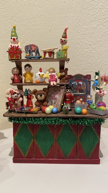 La semana pasada, alguien me sugirió si pondría un puesto de adornos navideños en mi belén.No estaba del todo convencida... pero sí que me di cuenta que le hacía falta un puesto de juguetes por que, ¿donde se iban a surtir los Reyes Magos si no?😉 así que, aquí está! creo que no le falta de nada. El mostrador es de poliestireno y madera pintados. Los juguetes estan hechos con cartulina y madera. Los peluches con pasta fimo y algunas figuritas de madera que tenia por casa. Está terminado por todos los lados incluso los que no se verán .