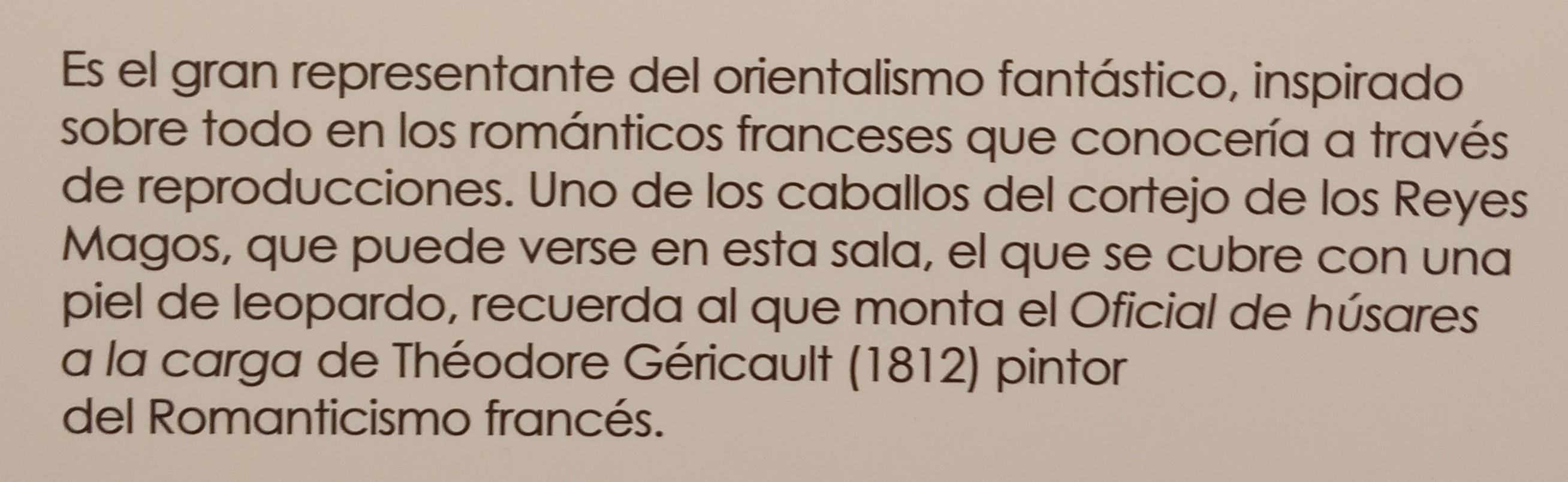Dentro de las influencias artísticas de Domenech Talarn i Ribot que hay muchas y variadas estan las pinturas románticas del pintor francés Théodore Géricault y exactamente en el titulado Oficial de cazadores a la carga (Museo de Louvre), que segun detalle del texto de la segunda y reciente exposición `Belenismo. Patrimonio material e inmaterial. 75 aniversario de la Asociación de Belenistas de Madrid´(hasta el 24 de enero de 2021), Museo Nacional de Artes Decorativas.