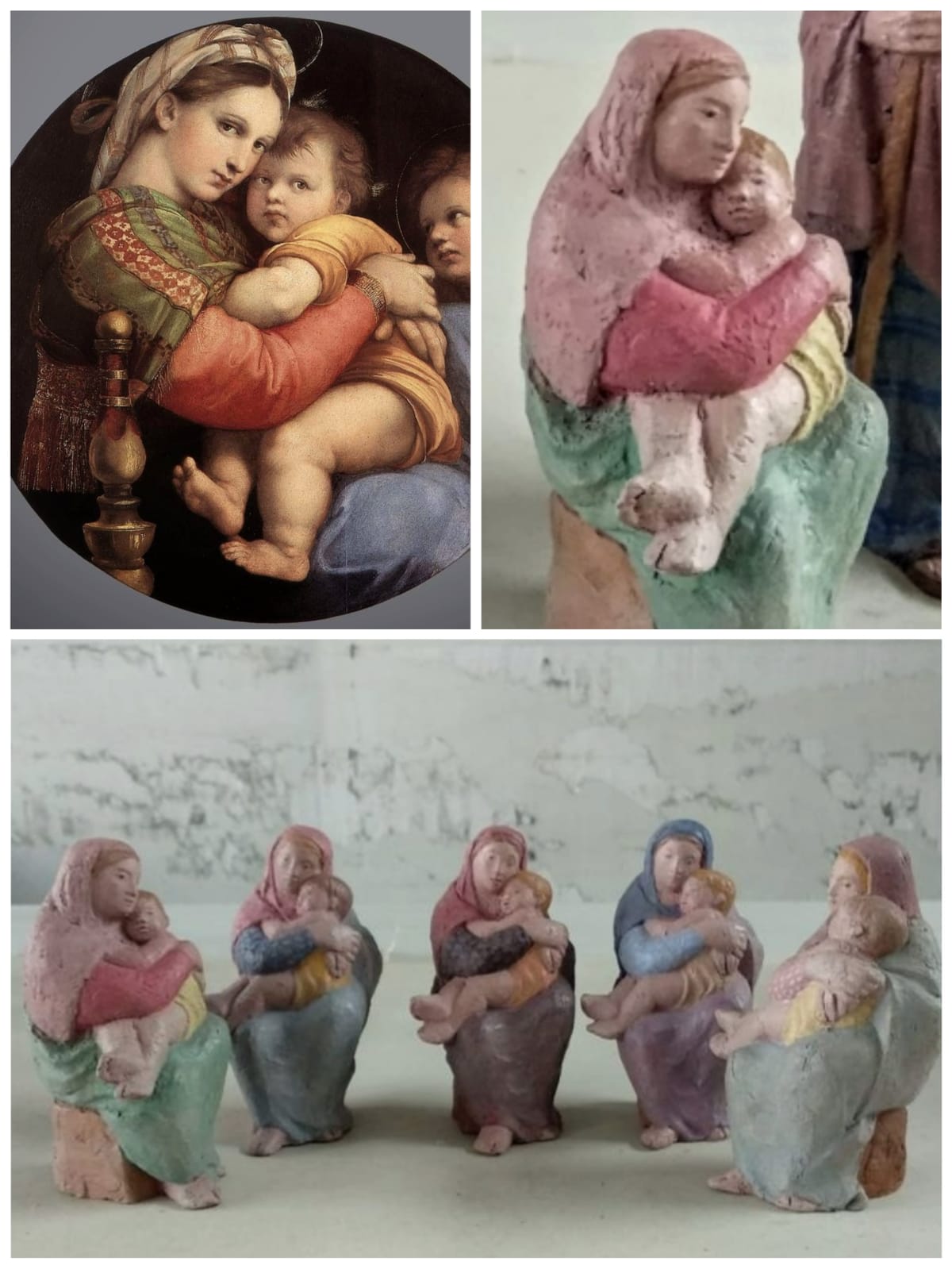 Font/Baldrich conocen la pintura y se inspiran también en su historia para reinterpretarla en una figura (la Virgen María y El niño Jesus, misterio 18cms.) que aúna la belleza de la campesina joven con su hijo con la representación del motivo religioso en una sutil línea entre lo profano y lo sagrado.