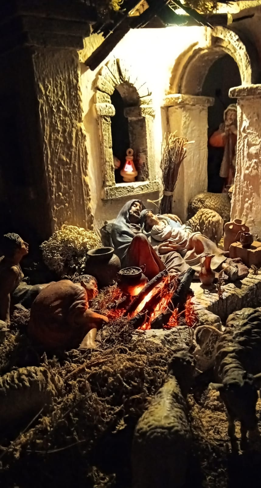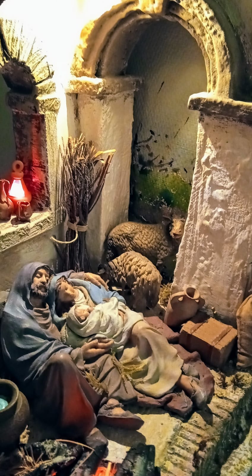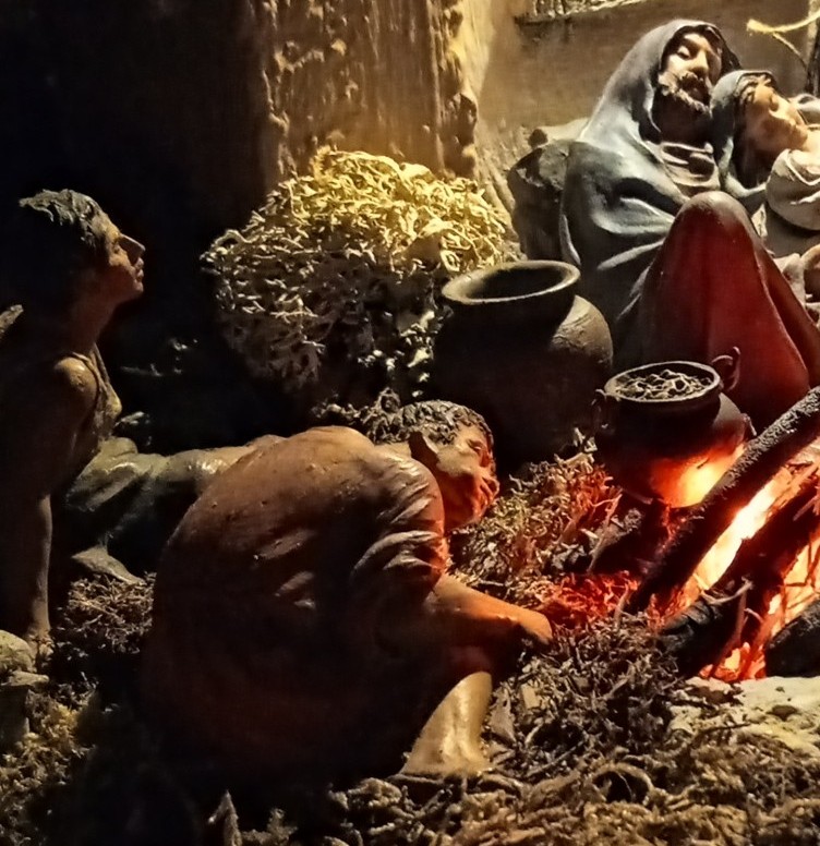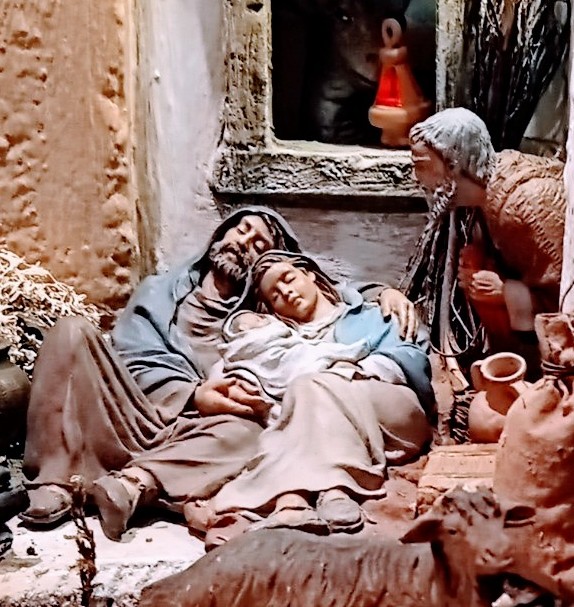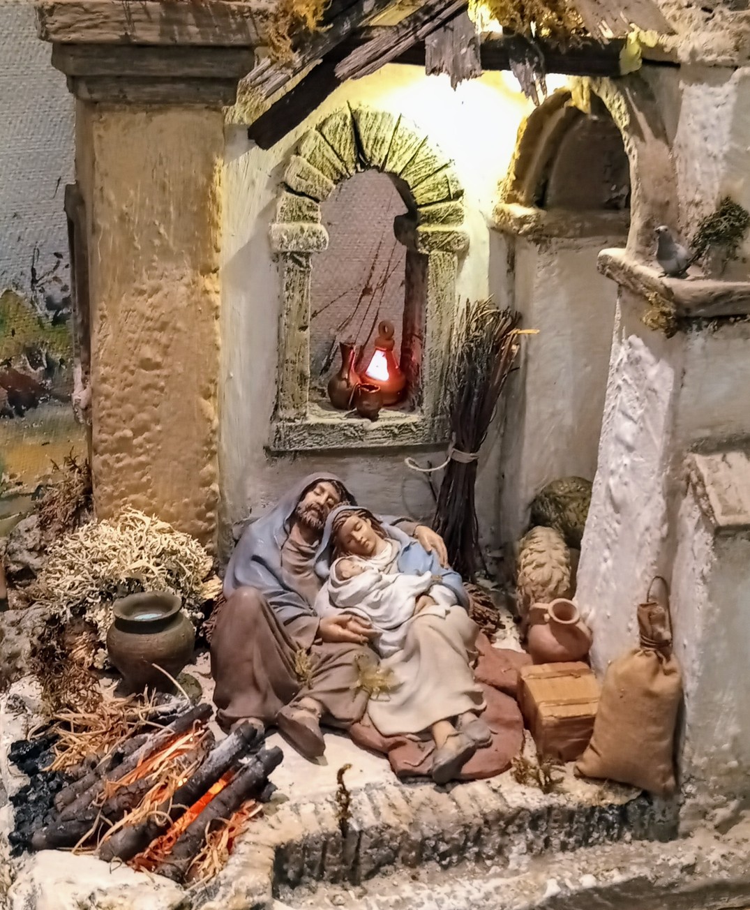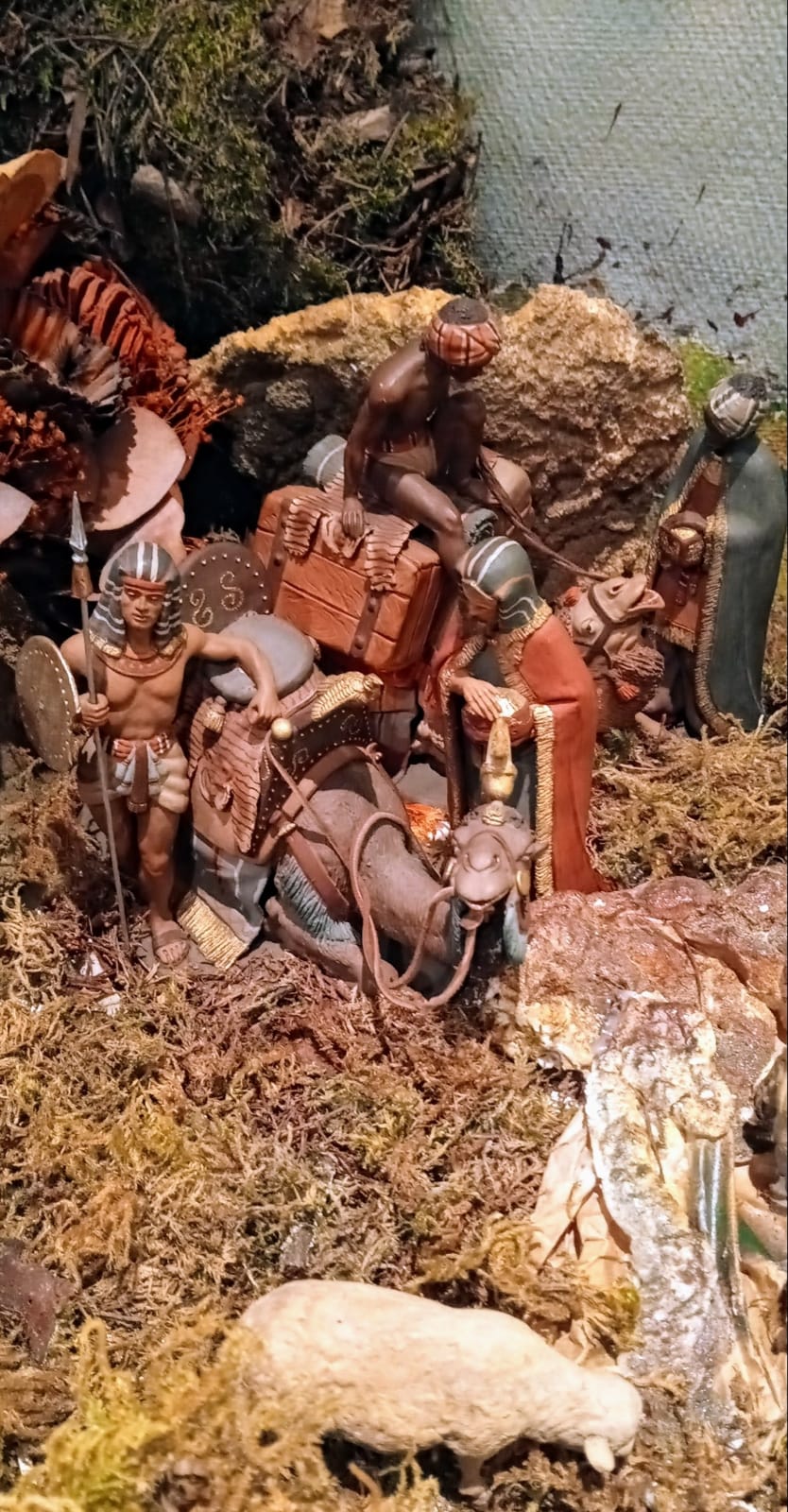 ...otro apunte era las diferentes capas y significados en la representación, en ésta figura ('buen descanso') de M.Ribes que es puro sentimiento, escenifica el descanso del viaje, conecta claramente con el final del belén 2020 y también como palimpsesto con la escena inicial del nuevo, el Nacimiento del niño Jesús...
