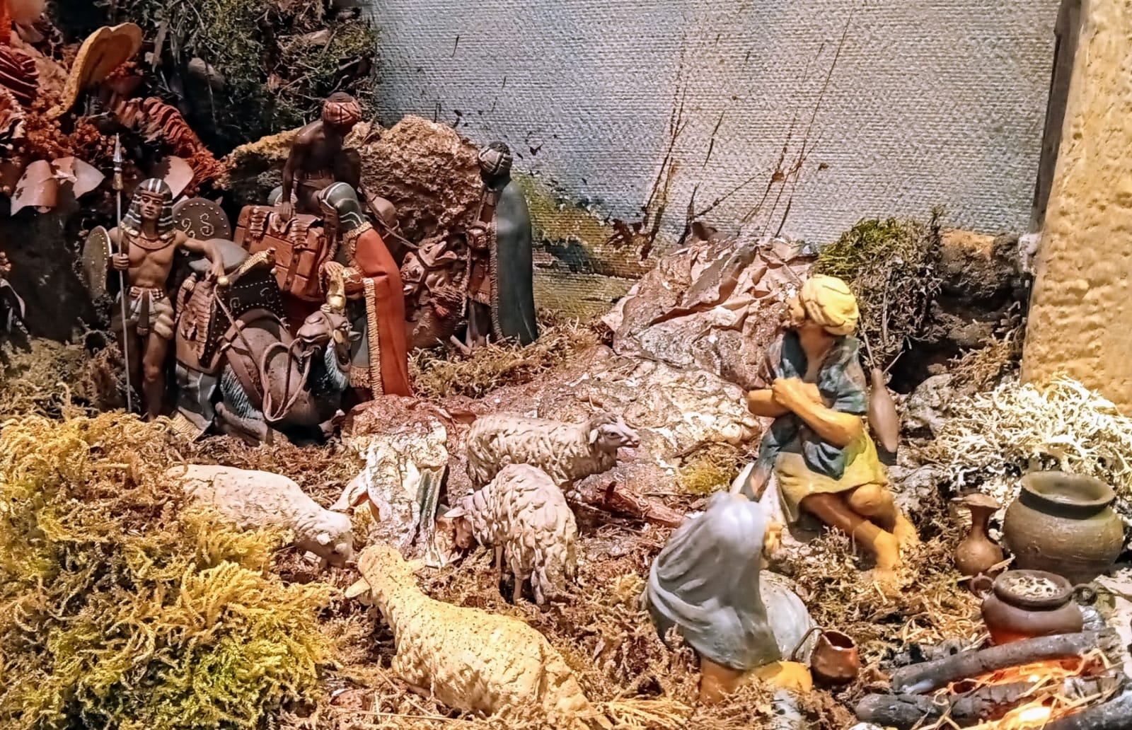 Con la ruina que simboliza a 'la humanidad caida' (Leyenda Áurea del dominico Jacopo da Varazze -siglo XIII-) los corderos que recuerda el porqué del nacimiento y el sacrificio del Mesías (la redención de la humanidad) prosigue el relato de nuestro belén 2021.
