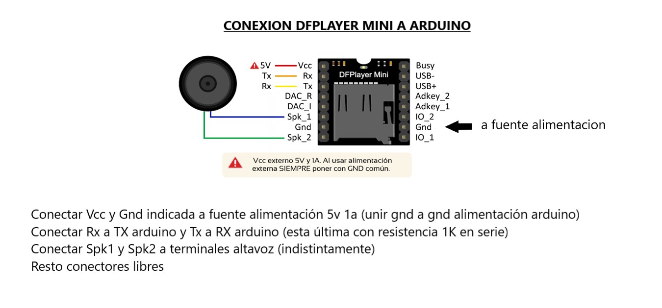 Aqui tienes un esquema para conectar el DFPlayer Mini a tu arduino: