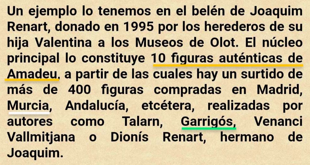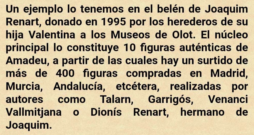 o las figuras también de los Vallmitjana de la colección de Apeles Mestres: ..."El Fondo Renart nace, inicialmente, de la donación que Apel·les Mestres hizo a su buen amigo Joaquim Renart cuando éste murió en 1936. Se trata de una colección extraordinaria que nos permite hacer un repaso del belenismo desde sus orígenes hasta mediados del siglo XX"(web Museu dels Sants d'Olot). Ya citada en el hilo de varios documentos ...