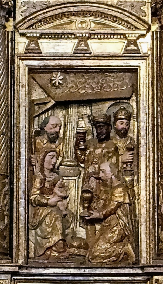 Sin embargo en el claustro de la catedral de Pamplona hay una Eñifanía que ha perfifo casi toda su policromía y sin embargo Baltasar está claramente esculpido con radgos dr raza negra.