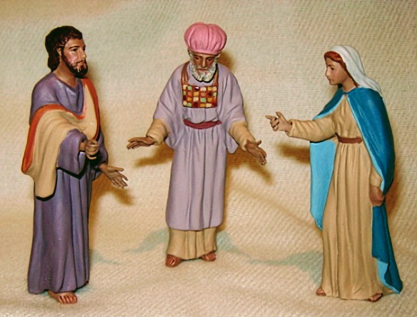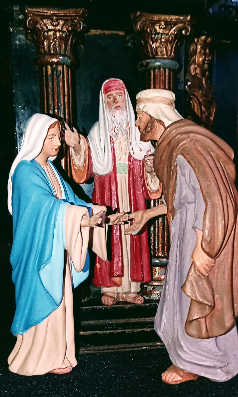 Lo que está claro es que es una escena con un mínimo de tres figuras, María, José con la vara florecida y el Sumo Sacerdote vestido con la túnica del "efod" y la placa pectoral de metal con joyas en el pecho. Castells tiene el grupo, no recuerdo si en 8 o en 11, se reutilizan figuras de otras escenas (el Sumo Sacerdote también está en Jesús frente a los sabios, en 8).