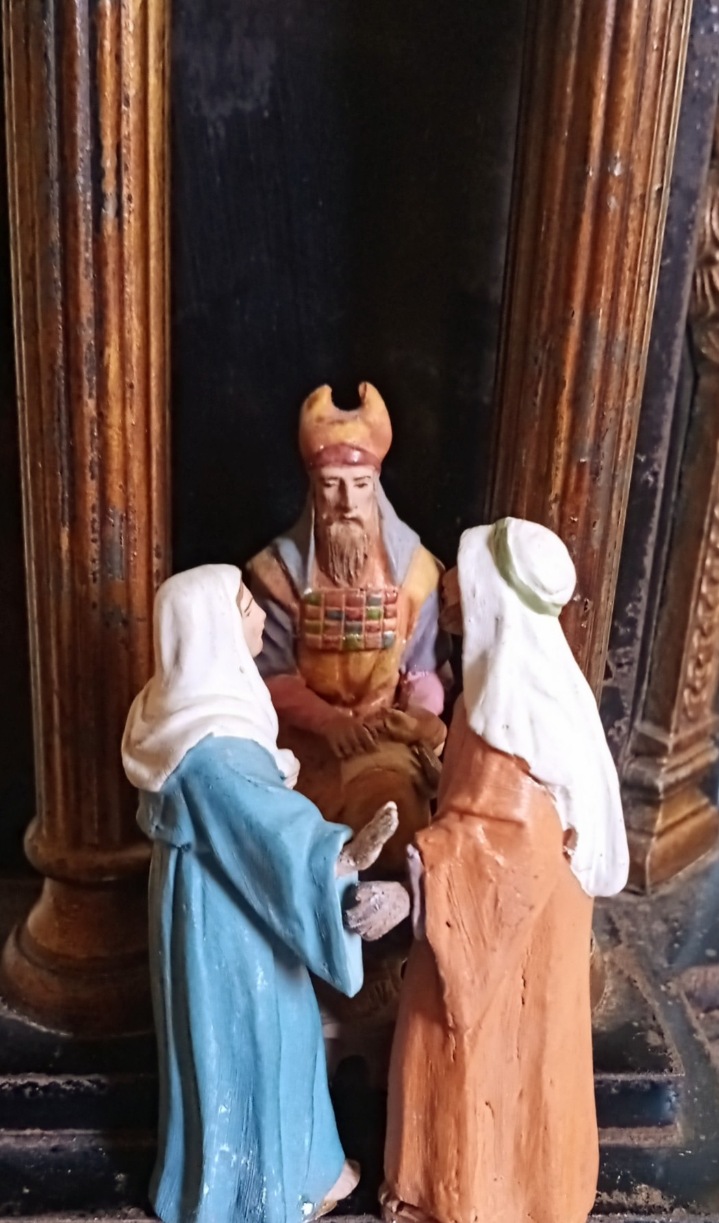 Otras tambien curiosas montadas en un plis plas, con el mismo sumo sacerdote, en este caso ya de pie la Virgen de la misma escena de los doctores y un San José que puede ser de una huida como de un Nacimiento.
