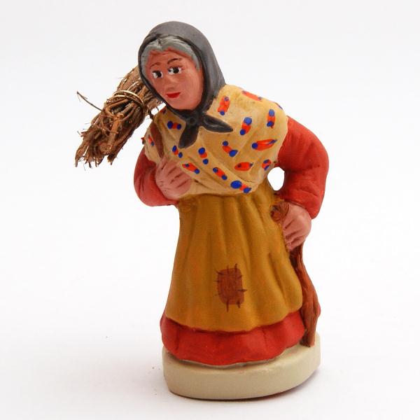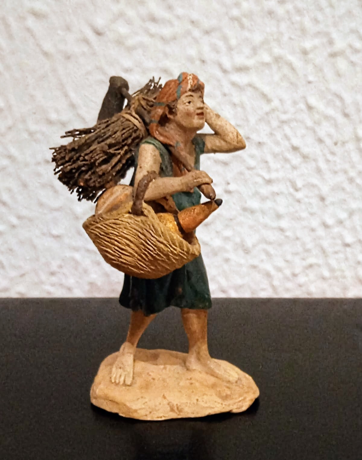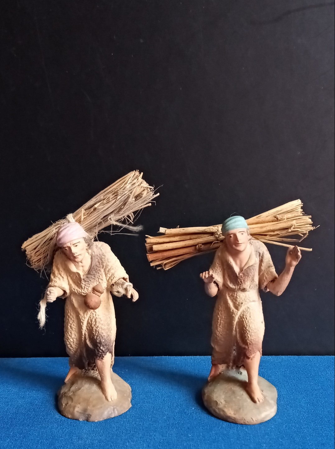 Las portadoras de leña en formato pequeño presentan una gran delicadeza en sus terminaciones. Sobresale especialmente la campesina que lleva el haz de leña sobre la cabeza —una representación poco habitual en el belén dentro de nuestro ámbito—, probablemente vinculada a alguna región concreta de la Provenza.