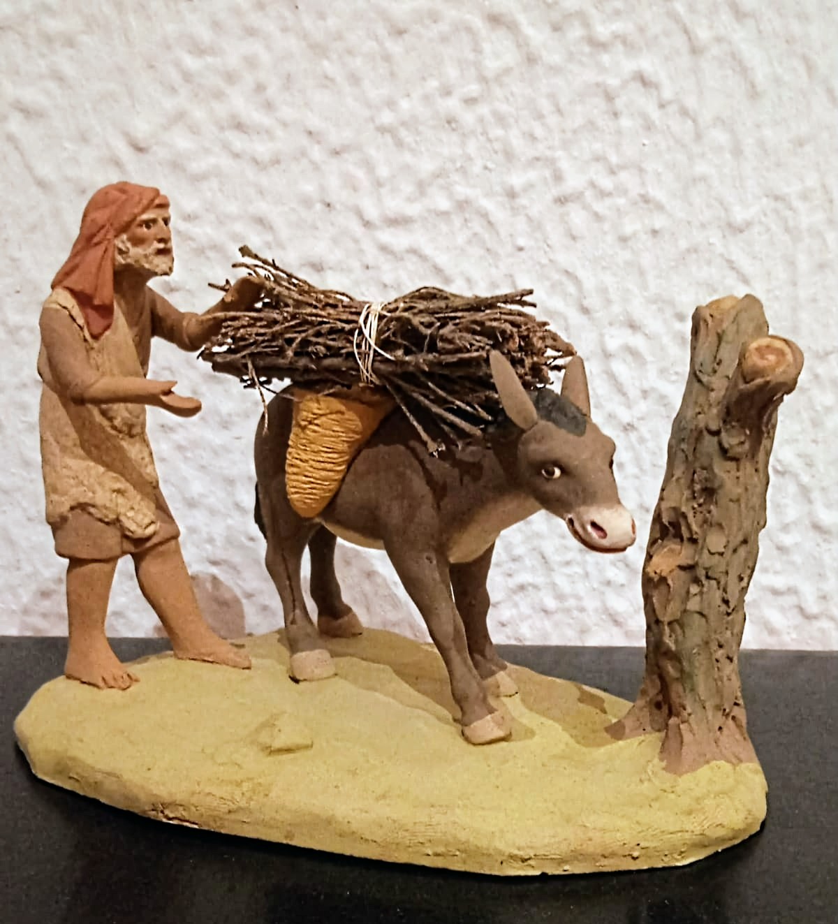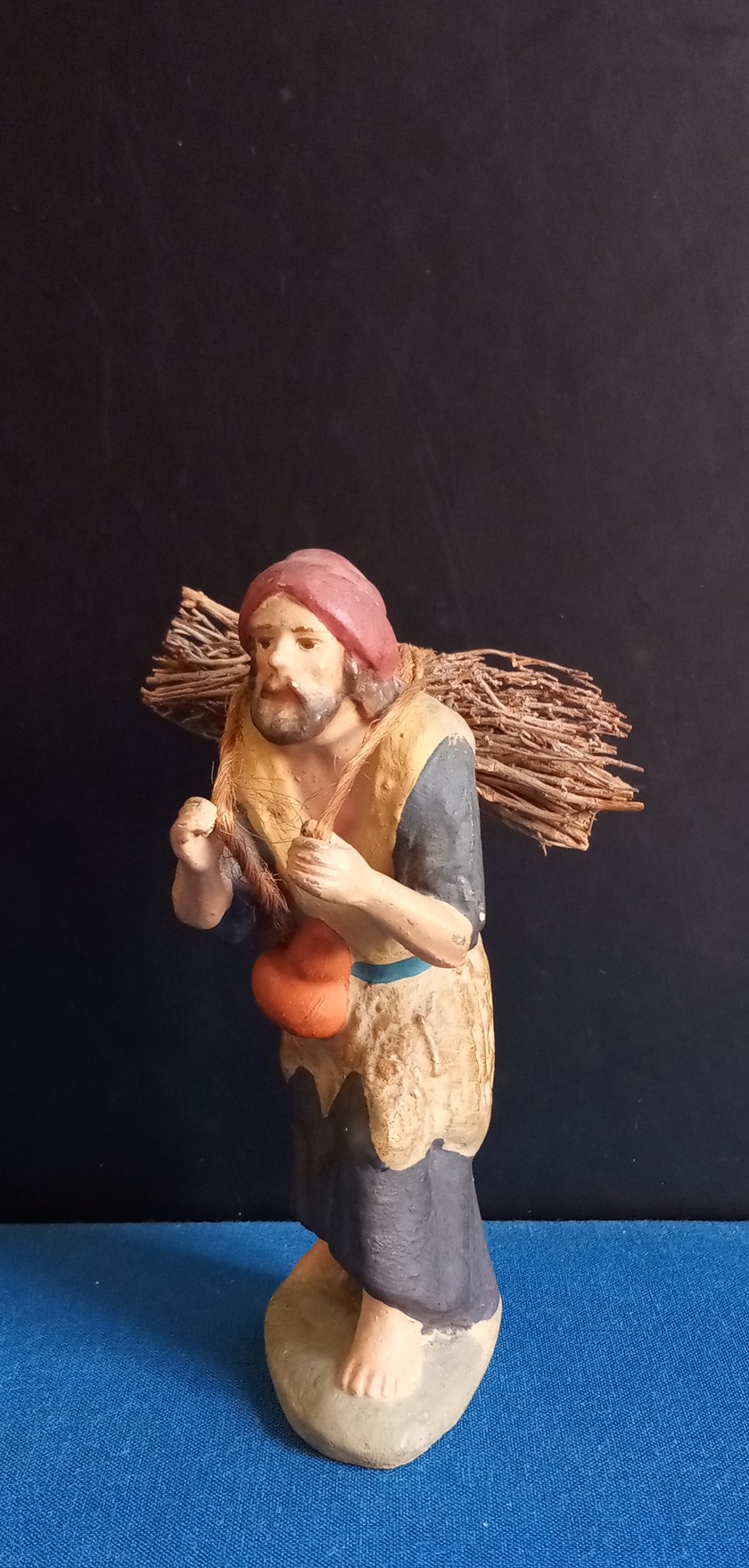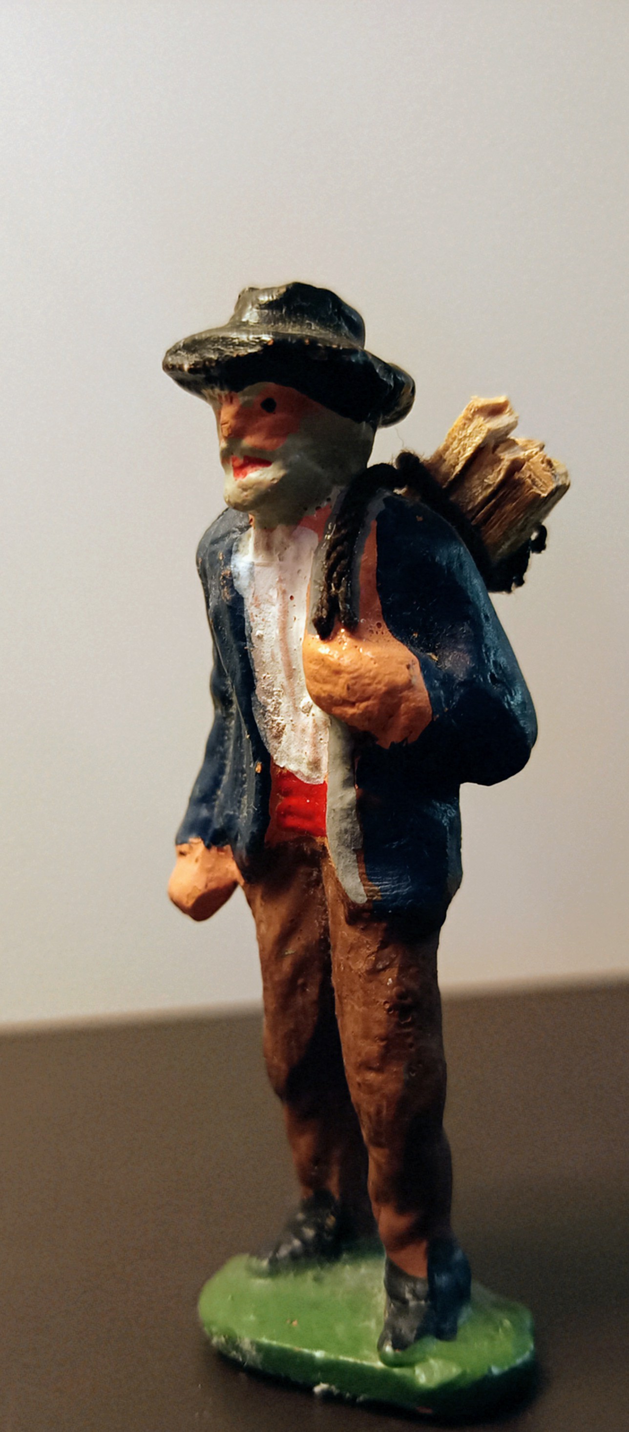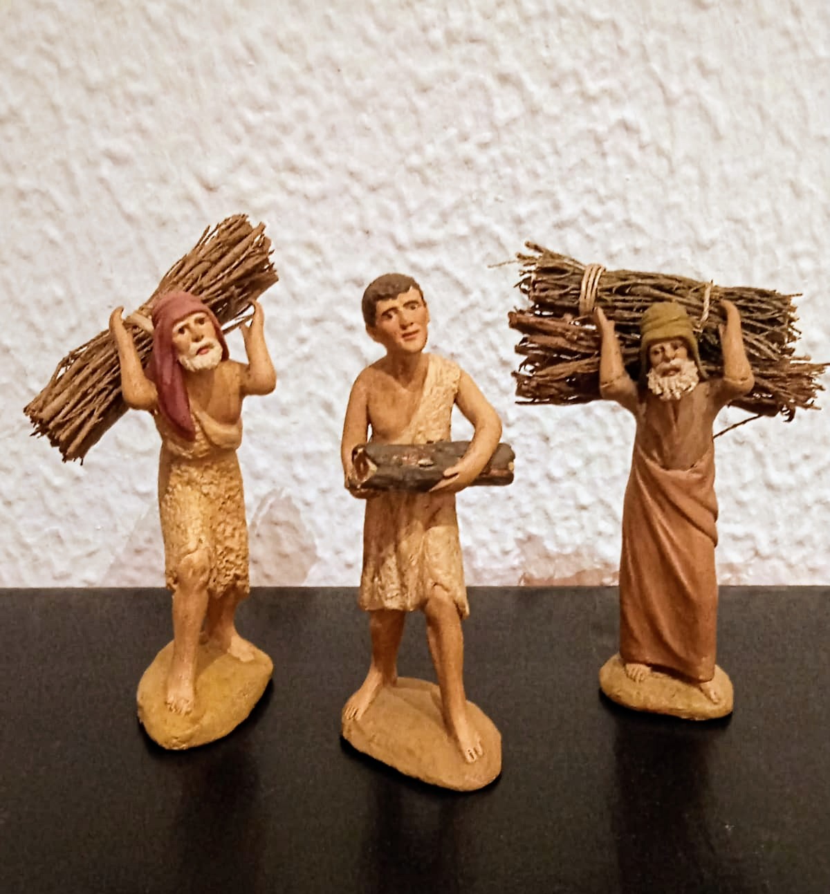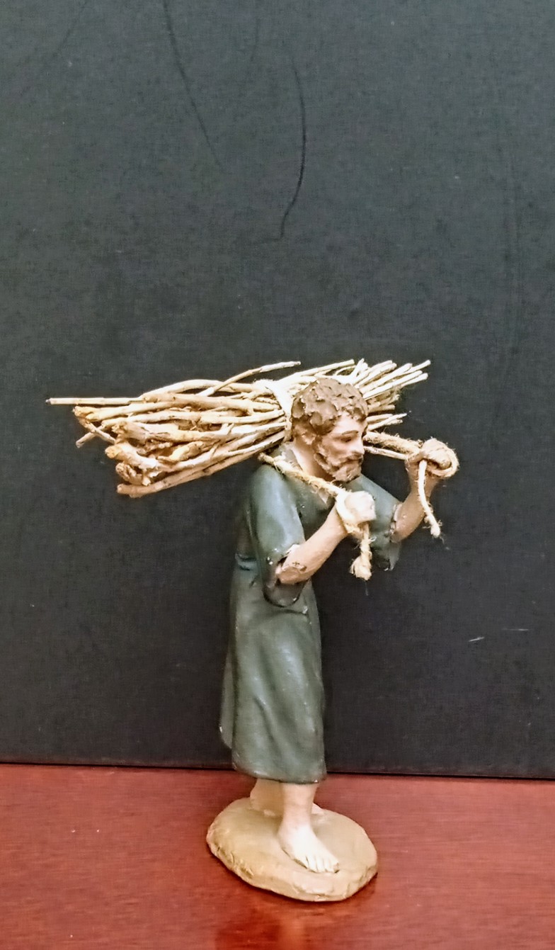 ..."Las figuritas que todavía hoy aparecen en el pesebre popular y que representan a gente del campo cargada con haces de leña en la espalda, en otros tiempos de mayor tradición en el pesebre formaban parte del grupo de quienes iban a ofrecer y llevaban un haz de leña para que la Sagrada Familia pudiera calentarse. En las iconografías pesebristas populares provenzal [467/1] y siciliana [459/2] también figura el hombre o la mujer con el haz de leña en el cuello. La tradición de san José que va a buscar leña para encender fuego en la cueva también está viva en Sicilia, puesto que Pitré describe una graciosa escena. [459/2]..."