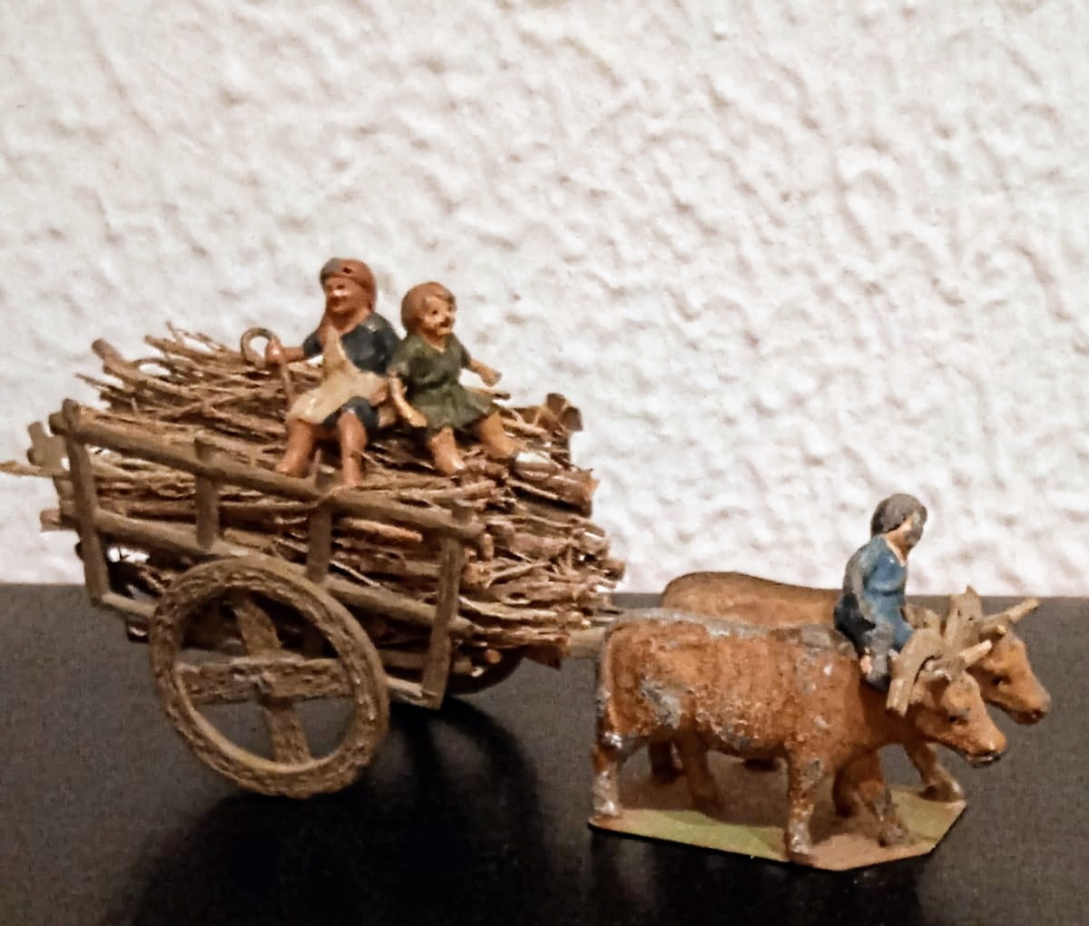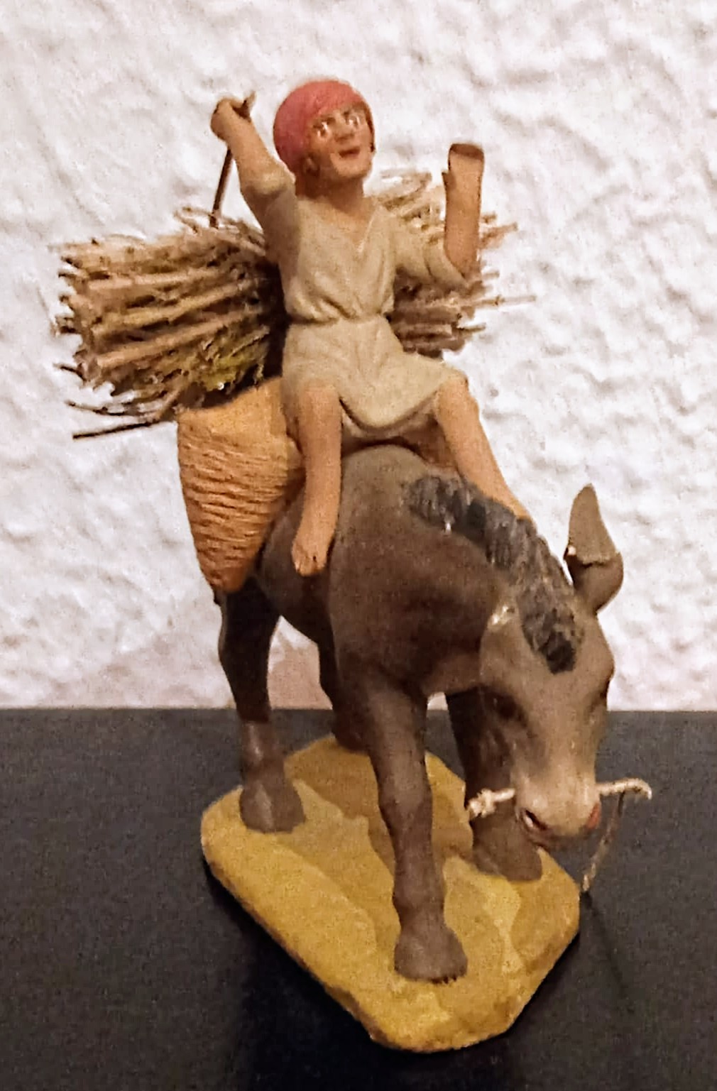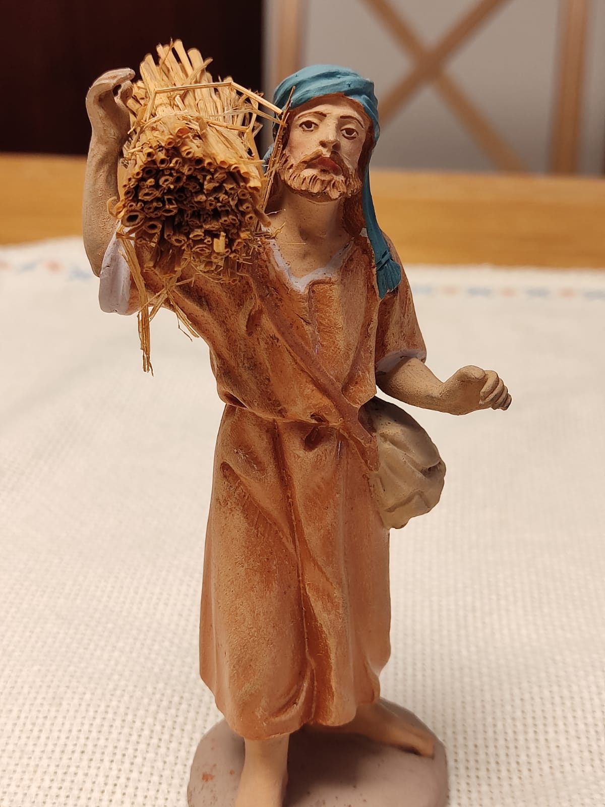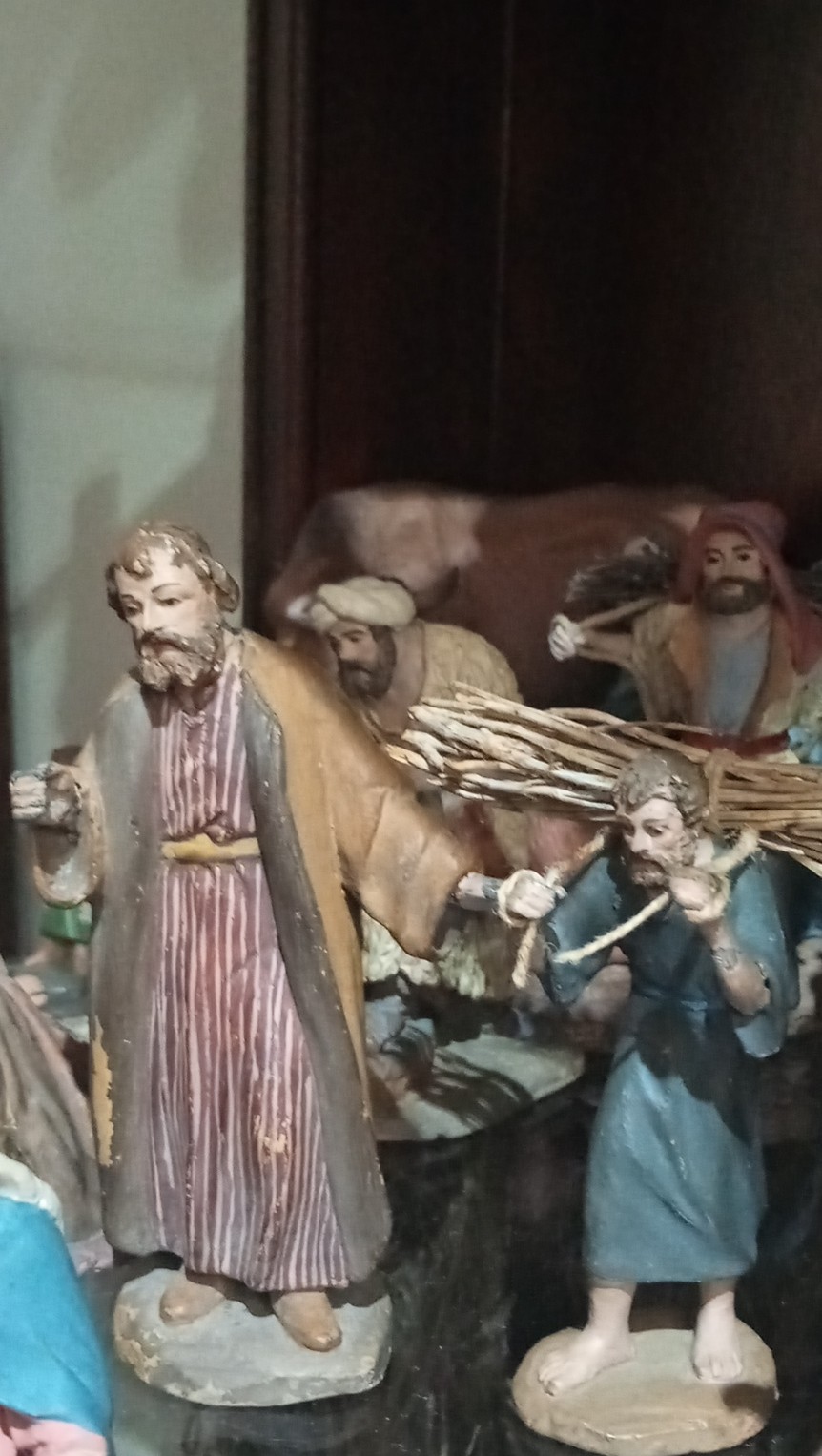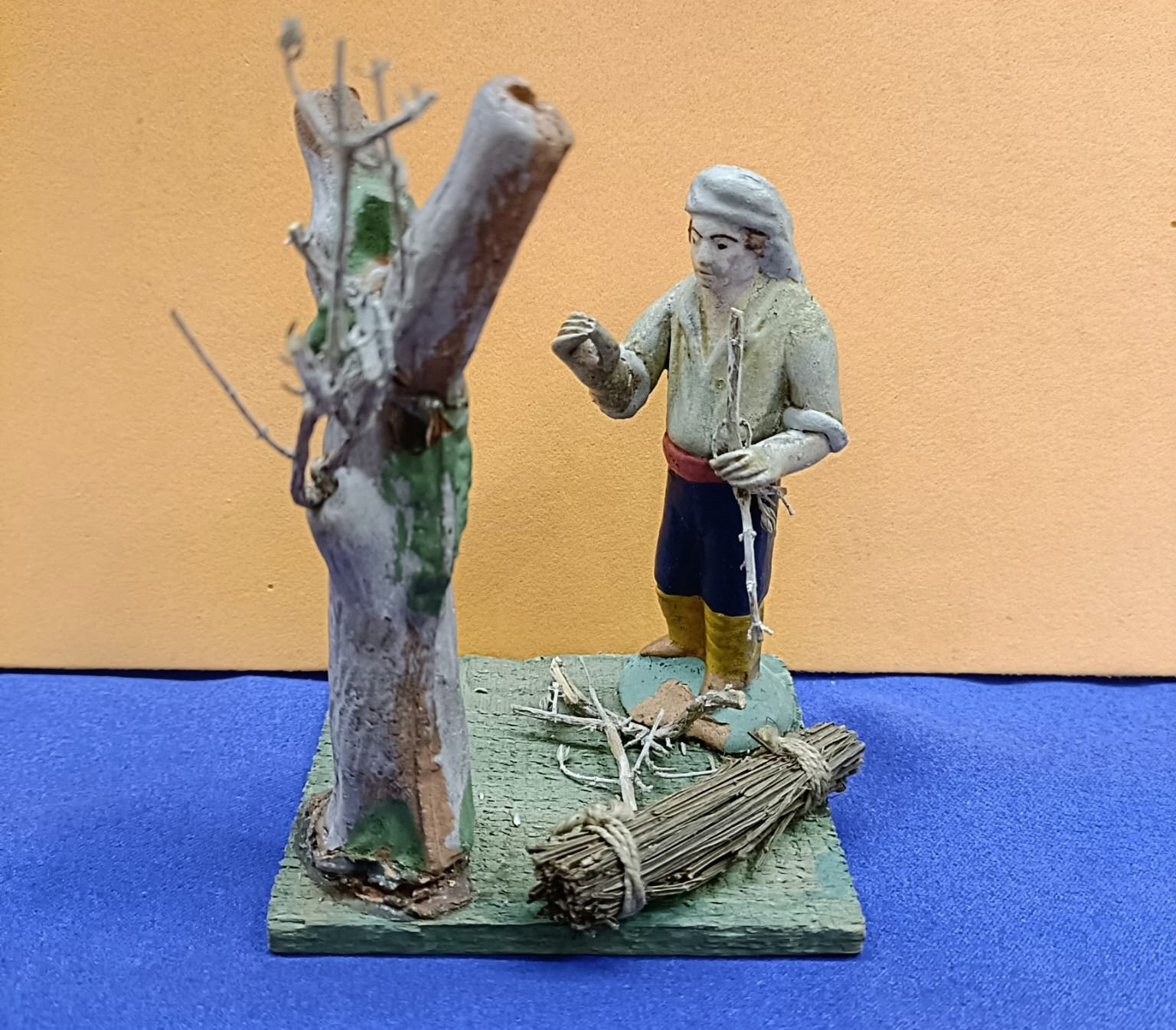 ..."Las figuritas que todavía hoy aparecen en el pesebre popular y que representan a gente del campo cargada con haces de leña en la espalda, en otros tiempos de mayor tradición en el pesebre formaban parte del grupo de quienes iban a ofrecer y llevaban un haz de leña para que la Sagrada Familia pudiera calentarse. En las iconografías pesebristas populares provenzal [467/1] y siciliana [459/2] también figura el hombre o la mujer con el haz de leña en el cuello. La tradición de san José que va a buscar leña para encender fuego en la cueva también está viva en Sicilia, puesto que Pitré describe una graciosa escena. [459/2]..."