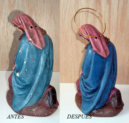 Me parece perfecta la opinión de tu hija, siempre que estemos hablando de una pieza única de indudeble valor artístico. Pero..... sie se trata de una pieza de serie que se podría cambiar por otra igual o mejor y de la que se quiere conservar el valor sentimental, siempre será mejor un apaño como los que muestra el maestro Zambrana que tenerlo tan destrozadito. Por cierto, maestro, ¿con qué pasta has reintegrado las partes que le faltaban al Niño?