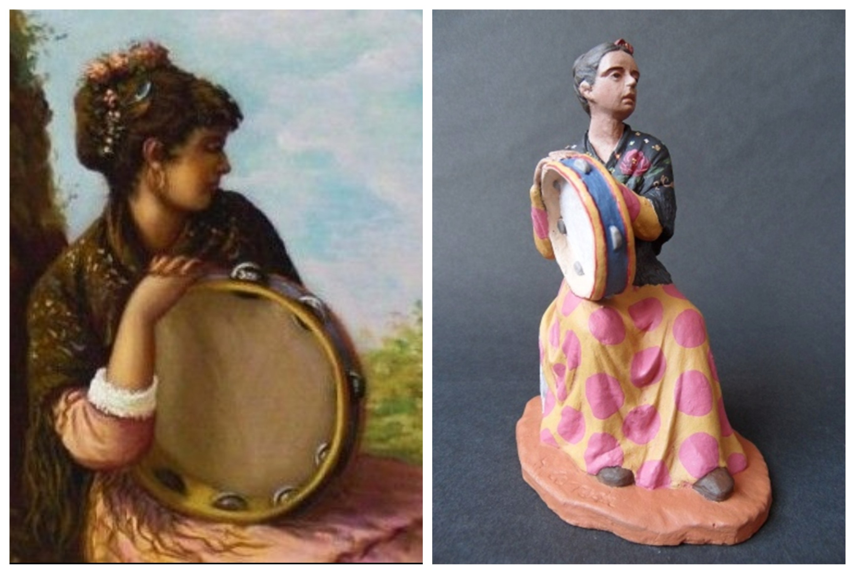 Los Hermanos Cerrada, en su serie popular, claramente se inspiran en fuentes de la pintura costumbrista, como se observa en esta figura de mujer con pandero, basada en la obra de López Galindo .