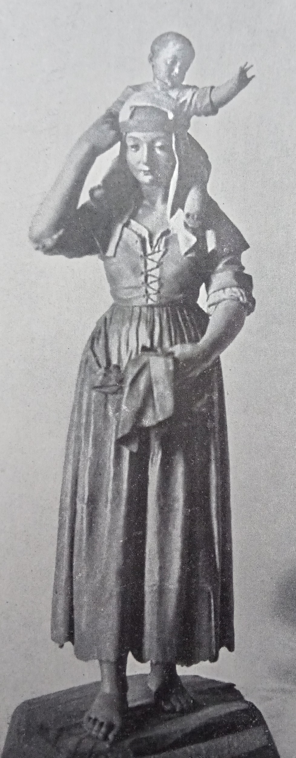 Según la postal antigua (encontrada en la Red) es una figura del primer y `auténtico´ figuraire de belenes español el autor olotino Ramón Amadeu (Barcelona 1745-1821), que representa a una madre con su hijo a hombros mientras realiza el trabajo de diario, doméstico o en la tierra de labranza; es de una belleza inusual por la finura de los detalles, (algunos como el cinto de cuero que amarra al hijo a su cabeza para trabajar con seguridad da a la propia figura de pesebre un carácter etnográfico que refleja al detalle la época), y por el modelado que le dan categoría museística o pertenencia a una gran colección.