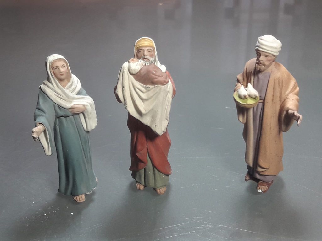 Jose y Maria. Marti Castells. Rest. Joan Castells.jpg (238KB - 80 descargas)Esta imagen que Felix nos regala para una de las tres posibles escenas de la vida de Jesús, la que nos narra el Evangelista Lucas en el capítulo 2, versículo 22... que en bebe de lo que dice el libro del Levítico en el versículo 8 del capítulo 12: "Si no le alcanza para ofrecer una res menor, tome..." [Para más información busquen en las librerías de casa o pulsen aquí ]