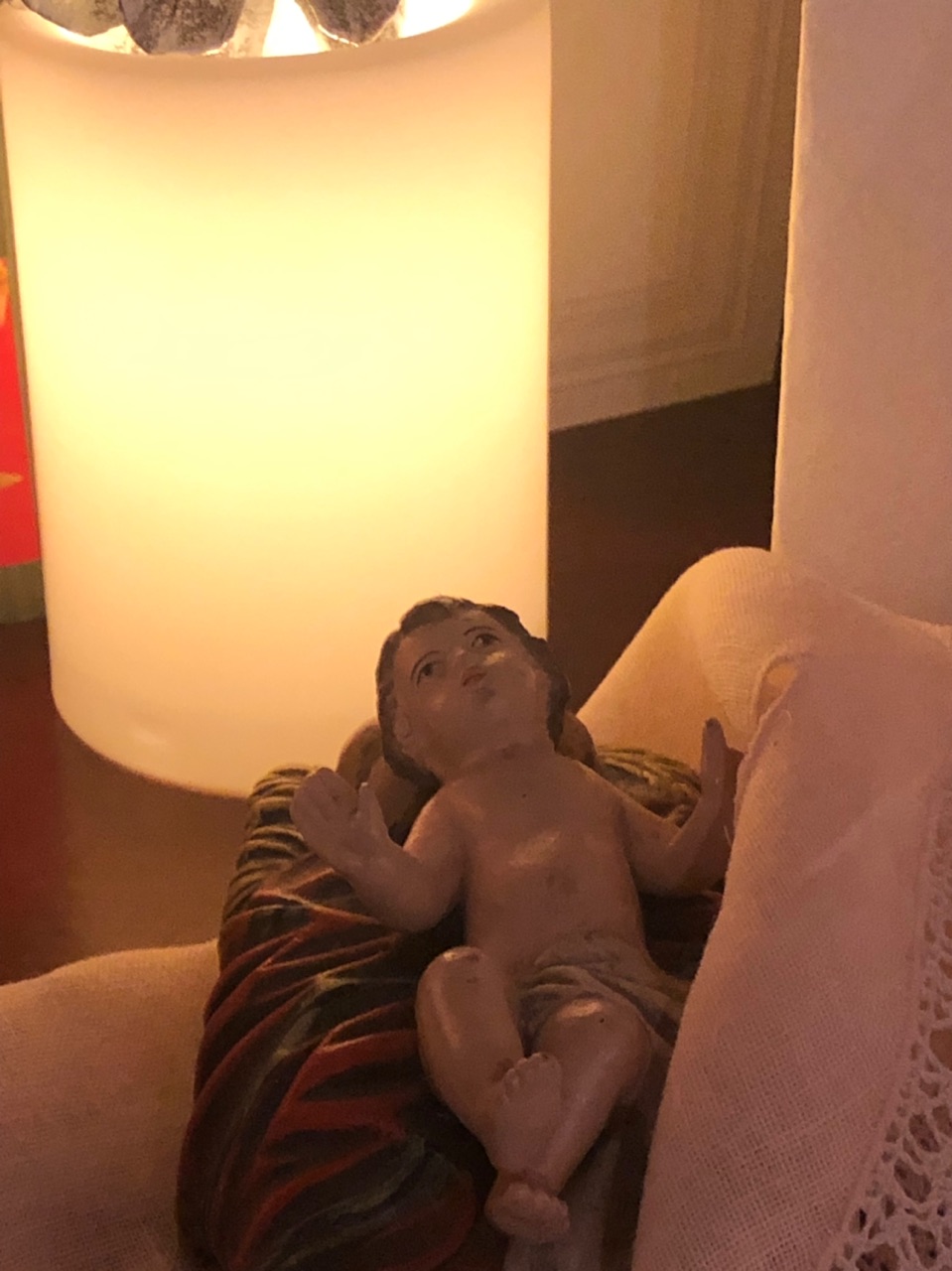 Comparativa con figura del Niño Jesús de un Nacimiento tradicional del mismo autor, sobre lecho de paja y a la derecha la descrita (envuelta en tela y sobre piedra) para colocarla junto a la representación de la torre ¡Migdal eder!...