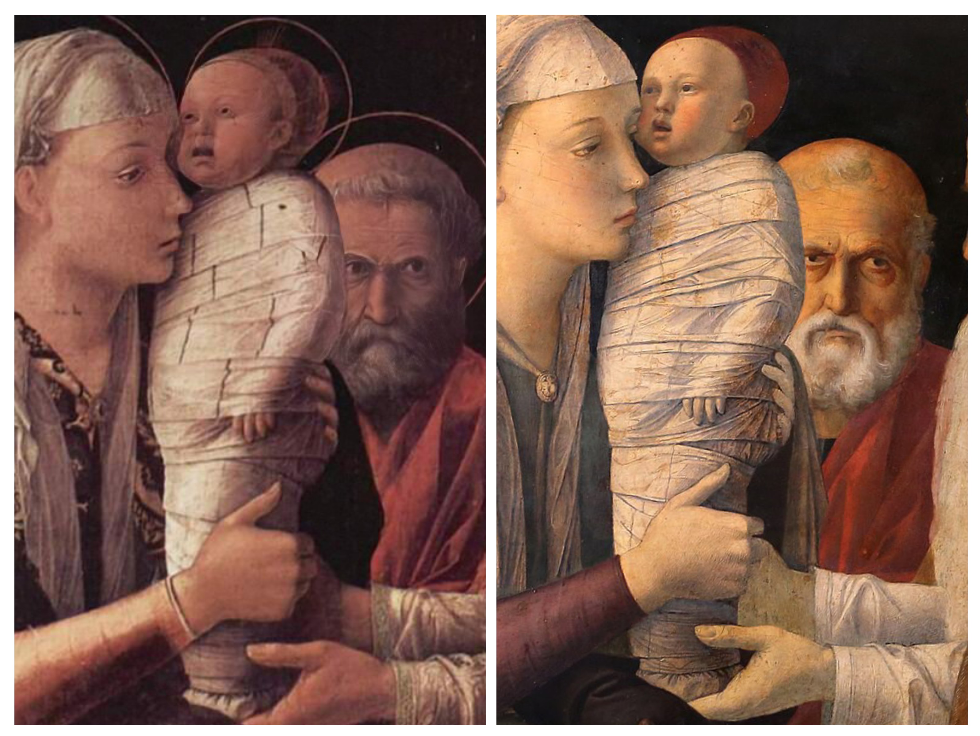 La presentacion en el Templo det.Jesus_Mantegna_Bellini.jpg (833KB - 62 descargas)Pero en la iconografía cristiana la representación del Niño Jesús envuelto en telas no es la usual.