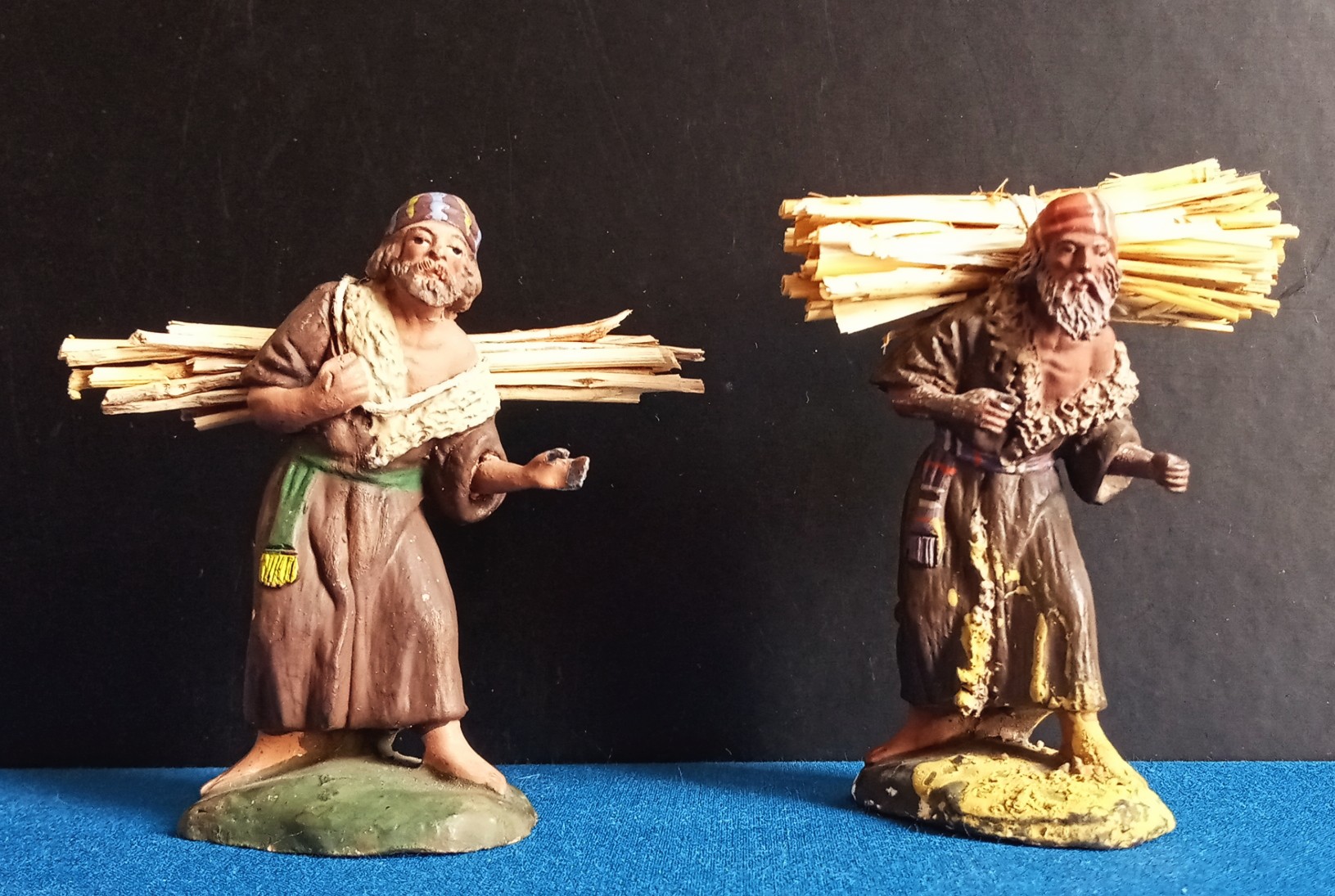 Las portadoras de leña en formato pequeño presentan una gran delicadeza en sus terminaciones. Sobresale especialmente la campesina que lleva el haz de leña sobre la cabeza —una representación poco habitual en el belén dentro de nuestro ámbito—, probablemente vinculada a alguna región concreta de la Provenza.