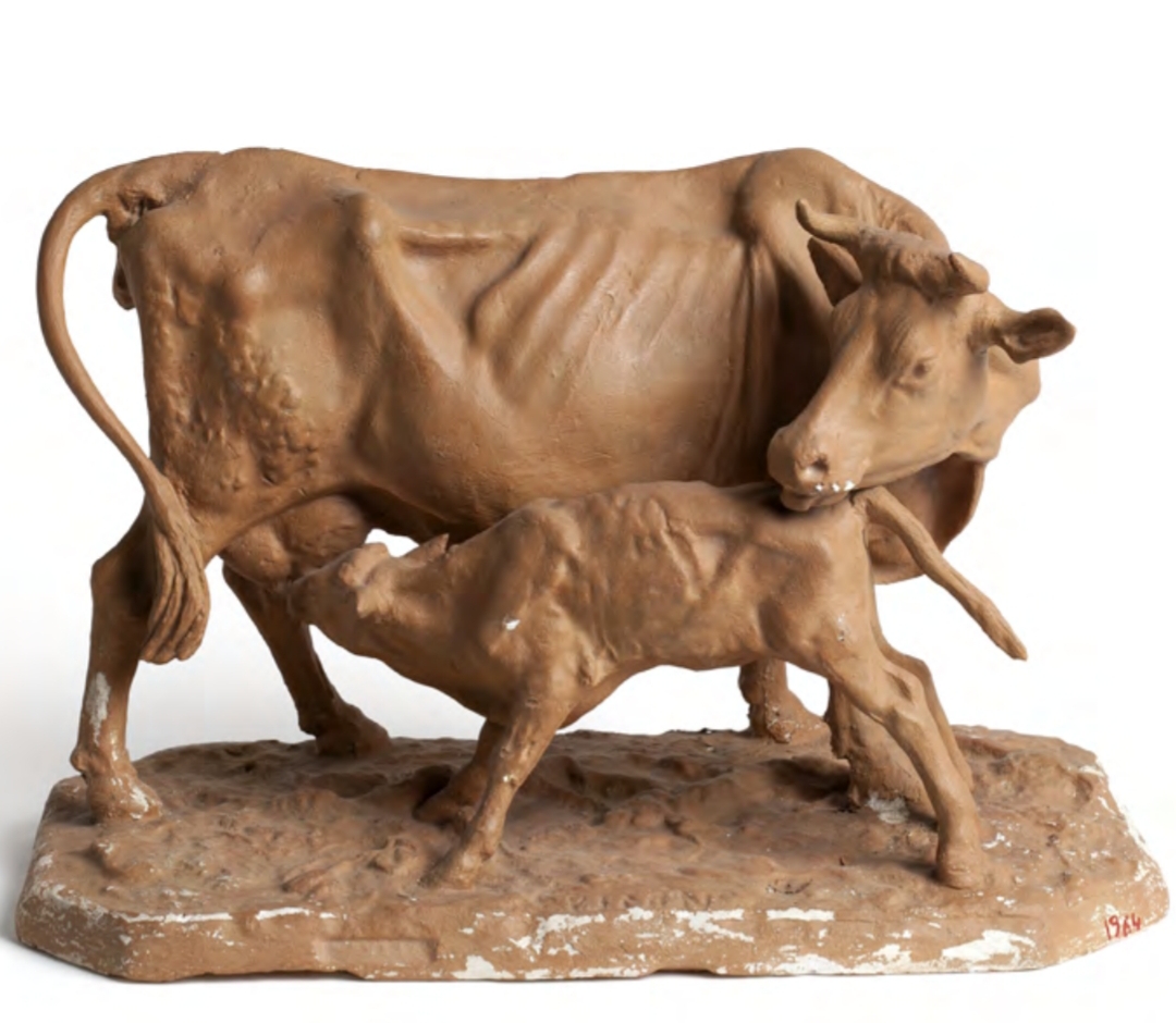 "Pierre-Jules Mêne fue uno de los escultores animalistas más destacados del siglo XIX, nacido en París en 1810 y fallecido en la misma ciudad en 1879. Se especializó en la creación de figuras de pequeño tamaño que representaban animales en movimiento, concebidas como esculturas de salón, de carácter principalmente decorativo. El gusto por este tipo de obras, conocidas popularmente como "bibelots", creció en la Francia del Segundo Imperio y se mantuvo hasta bien entrado el siglo XX en todo el mundo occidental. Esta pieza en concreto representa a una vaca amamantando a su ternero, sobre una base; las dos figuras que la componen se entrelazan, una disposición que otorga dinamismo al conjunto. Llama la atención que tanto la vaca como su ternero parecen sucios y desnutridos, lo que transmite una impresión de fragilidad y vulnerabilidad que constituye la clave de la obra.