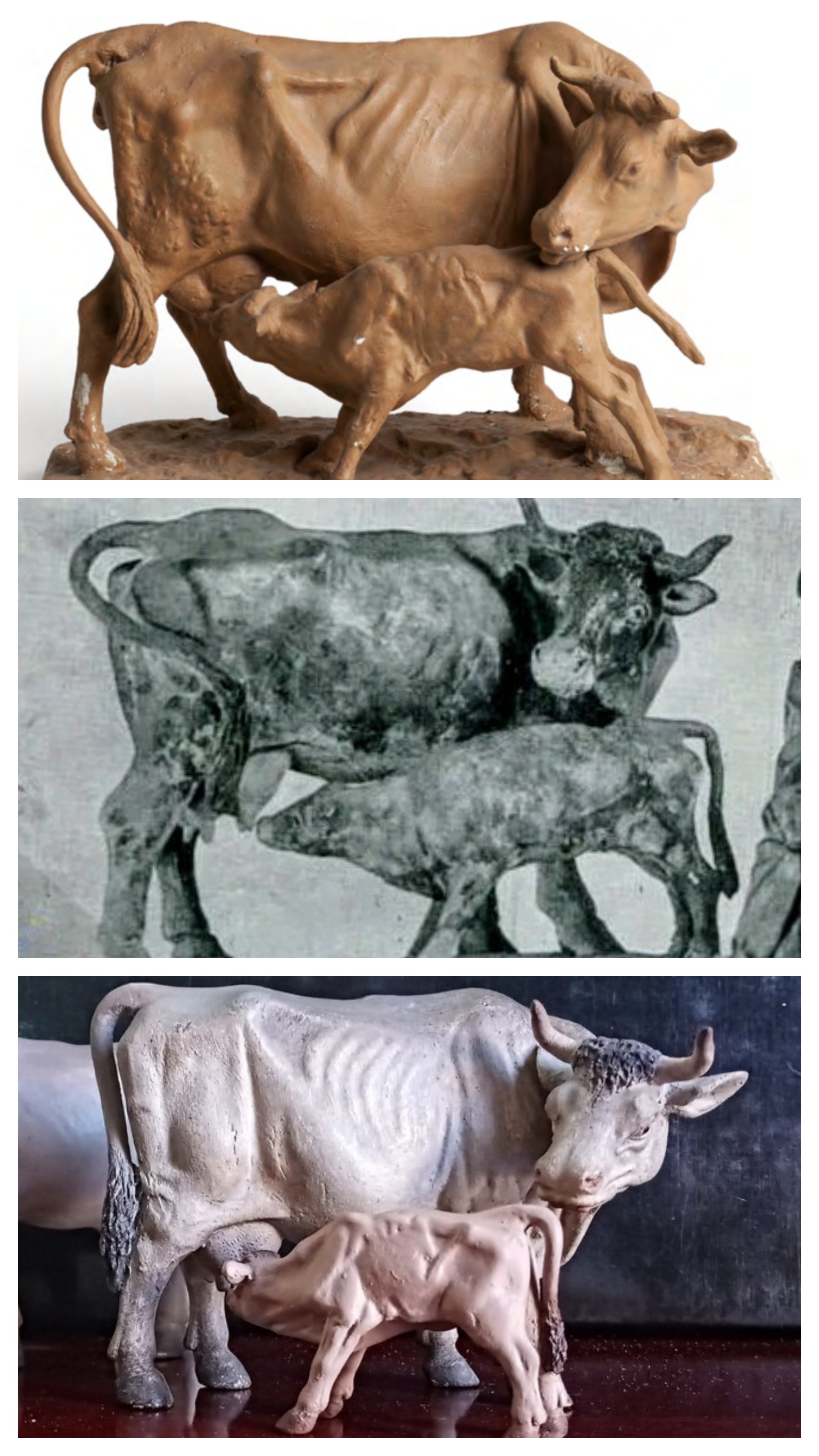 La escayola de la colección del Museo podría tratarse de una copia antigua de la obra original realizada por Mêne hacia 1843 y titulada Vache flamande et son veau. En el Museo del Louvre de París se conserva una versión en cera con pátina negra (RF 1903) y un boceto (RF 4458 del bronce que figuró en el Salon des Beaux-Arts de la capital francesa en 1845 (n.º 2143). La cera del Louvre tiene unas dimensiones muy similares a las de la escayola conservada en el Museo, y mantiene la ubicación y el formato de la firma de Pierre-Jules Mêne, sobre la base, entre las patas izquierdas del ternero. Es una pieza muy popular, de la que existen numerosas reproducciones en materiales diversos, y versiones con mayores o menores diferencias respecto al original, como la de la antigua colección de Apel·les Mestres, empleada como figurita de belén.