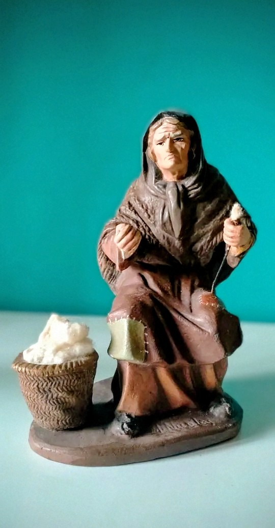 IMG_20250628_185119.jpg (3742KB - 32 descargas)Amigo Hernán, no sabía que tenías esta figura (15 cm), y no se trata de una hilandera anónima: es la Virgen. Como apunta Amades en El Pessebre, la figura de la hilandera tiene tal relevancia en el Belén, que incluso hace hilar a la Virgen María, como signo de buena ama de casa, condición que no podía faltar en la madre del Niño Jesús.