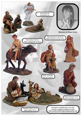 Montse Ribas hace todas sus figuras en resina. Son muy originales y muy funcionales, puesto que encajan en casi cualquier belén. En muchos dioramas catalanes se usan sus figuras para el segundo o tercer plano, puesto que son realistas en el gesto y nada chillonas. Yo destaco su producción de figuras no hebreas, de tipos rurales atemporales, que sirven para cualquier tipo de belén costumbrista e incluso hebreo. Un gran ejemplo es el belén que ha hecho para el 2007 Jose de El Pesebre