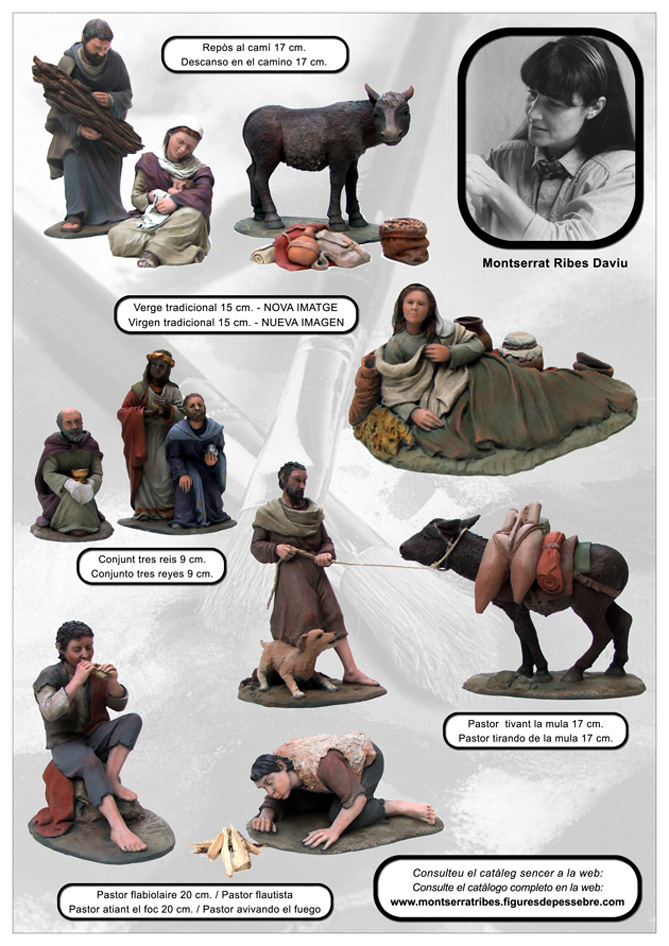 Montse Ribas hace todas sus figuras en resina. Son muy originales y muy funcionales, puesto que encajan en casi cualquier belén. En muchos dioramas catalanes se usan sus figuras para el segundo o tercer plano, puesto que son realistas en el gesto y nada chillonas. Yo destaco su producción de figuras no hebreas, de tipos rurales atemporales, que sirven para cualquier tipo de belén costumbrista e incluso hebreo. Un gran ejemplo es el belén que ha hecho para el 2007 Jose de El Pesebre