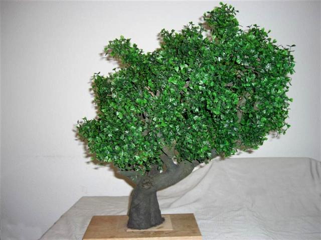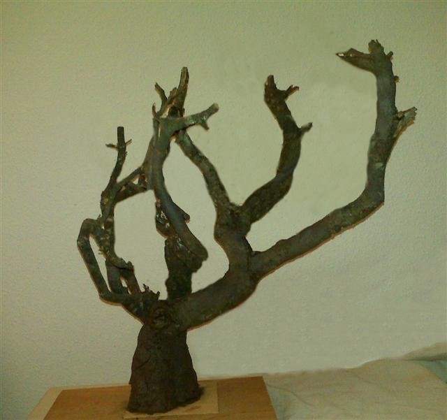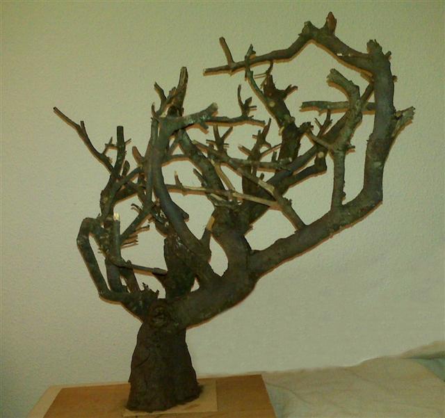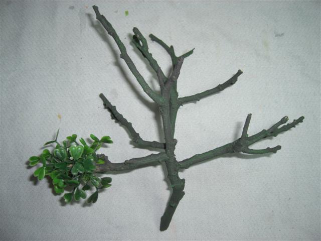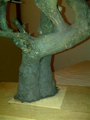 6) Cuando esté seco, se pinta todo el tronco, simulando los colores de la rama original, en mi caso marrón + negro + un poco de verde. Luego se le da un pincel seco de color gris. Si queremos simular la verdina se da un pincel seco de color verde. Con este toque se le puede da un aspecto de árbol viejo.