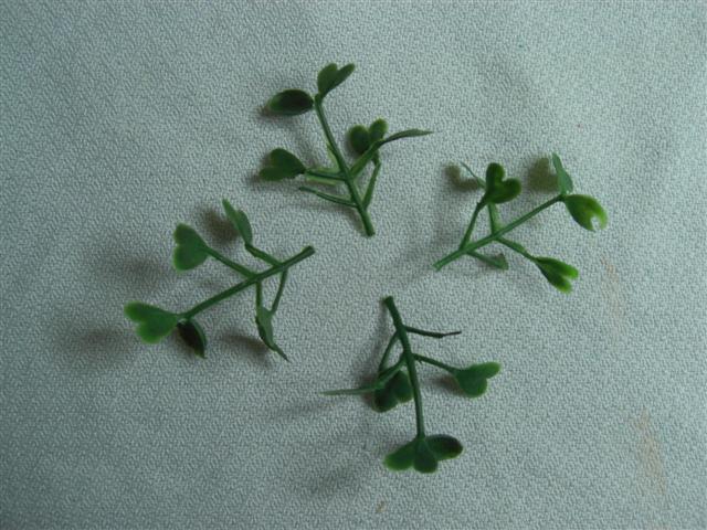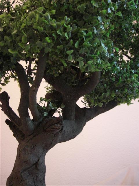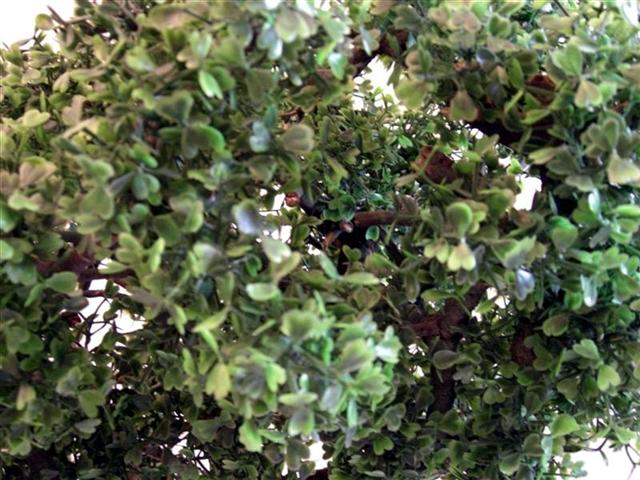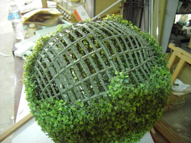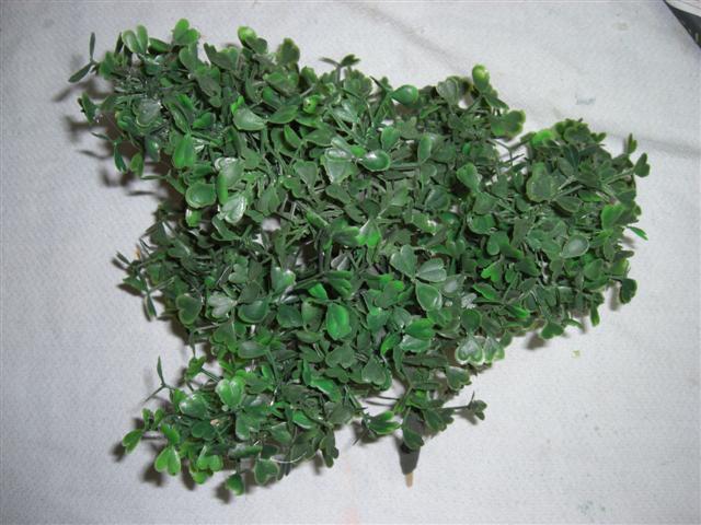 Al final, a comprar las hojas de plástico de los chinos. Encontré una bola de decoración, de tamaño un poco mayor que un balón de baloncesto, que trae unas hojitas de plástico en grupos de cuatro ramitas (aquí hago mención a la ayuda del forero J. David que puso un poco de “luz en mi oscuridad”, de echo incluyo una foto que puso en el foro). Desmonté de la bola de decoración cada grupo de hojitas, cortando y separando cada ramita (salen cuatro). Aquí recibí la inestimable e impagable ayuda de mi mujer (Araceli) y de mi hijo (Jesús), que se hincharon de desmontar y cortar hojitas (Foto4 y Foto5).