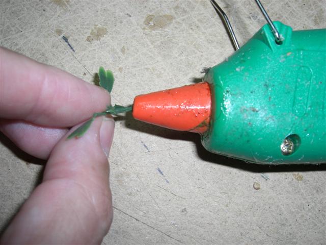 8) Para unir las hojas a las ramas más pequeñas, podadas al principio, se puede utilizar la pistola de cola caliente, ya que son muchas hojas y debe ser lo más rápido posible. Además como las hojas son de plástico, el calor las derrite y lo hace muy fácil, aunque muy laborioso. Para que no se vean pegotones de cola, lo que se hace es introducir las hojas en el orificio de la punta de la pistola, el calor las derrite un poco y entonces se pulsa el gatillo para que deje una pequeña cantidad de cola. Después se pegan las hojas a las ramas. Esto hay que hacerlo con mucha celeridad, ya que ésta cola se seca muy rápido. Se repite hasta que se vea que la rama queda cubierta. ¡¡Ojo, tened mucho cuidado con las quemaduras!! (Foto6, Foto7, Foto8 y Foto9).