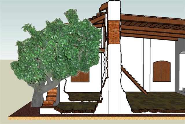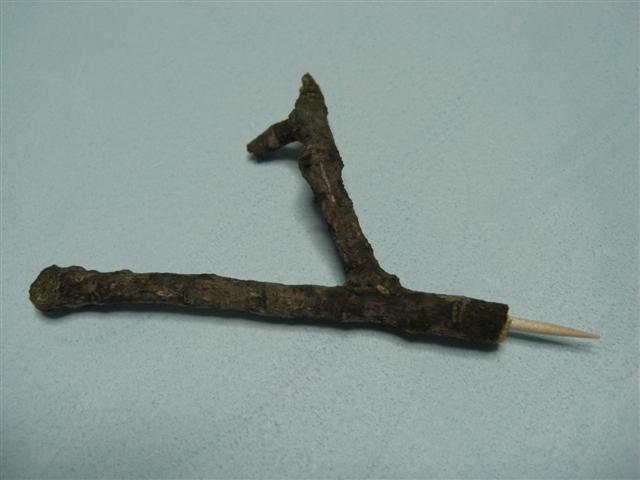 4) Las ramas podadas anteriormente más grandes, las uní a las ya existentes haciendo un pequeño taladro con la Dremel y, dependiendo del tamaño de la rama, se le pega a modo de tubillón un palillo de dientes o un palillo de los que se usan para los pinchitos de pollo, con cola de carpintero, para darle fuerza a la unión. El serrín que se obtiene al cortar las ramitas y hacer los taladros, se va pegando en la unión de la rama con el tronco principal, para simular dichas uniones lo máximo posible (Foto2).