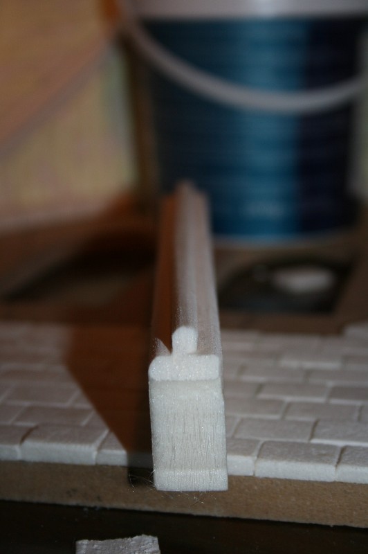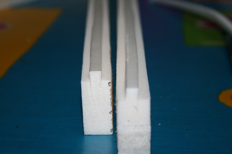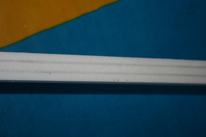 1º -Manera manual(para las nervaduras de la boveda):Corto el trozo de porex a la medida deseada y marco las lineas de corte(foto1).A continuacion pongo una "guia" de profundidad en la hoja del cutter para no pasarme(foto2),cortamos si hace falta con dos pasadas y listo.Despues solo es redondear los cantos con lija(foto 4) y cortar con la maquina cortadora la altura deseada