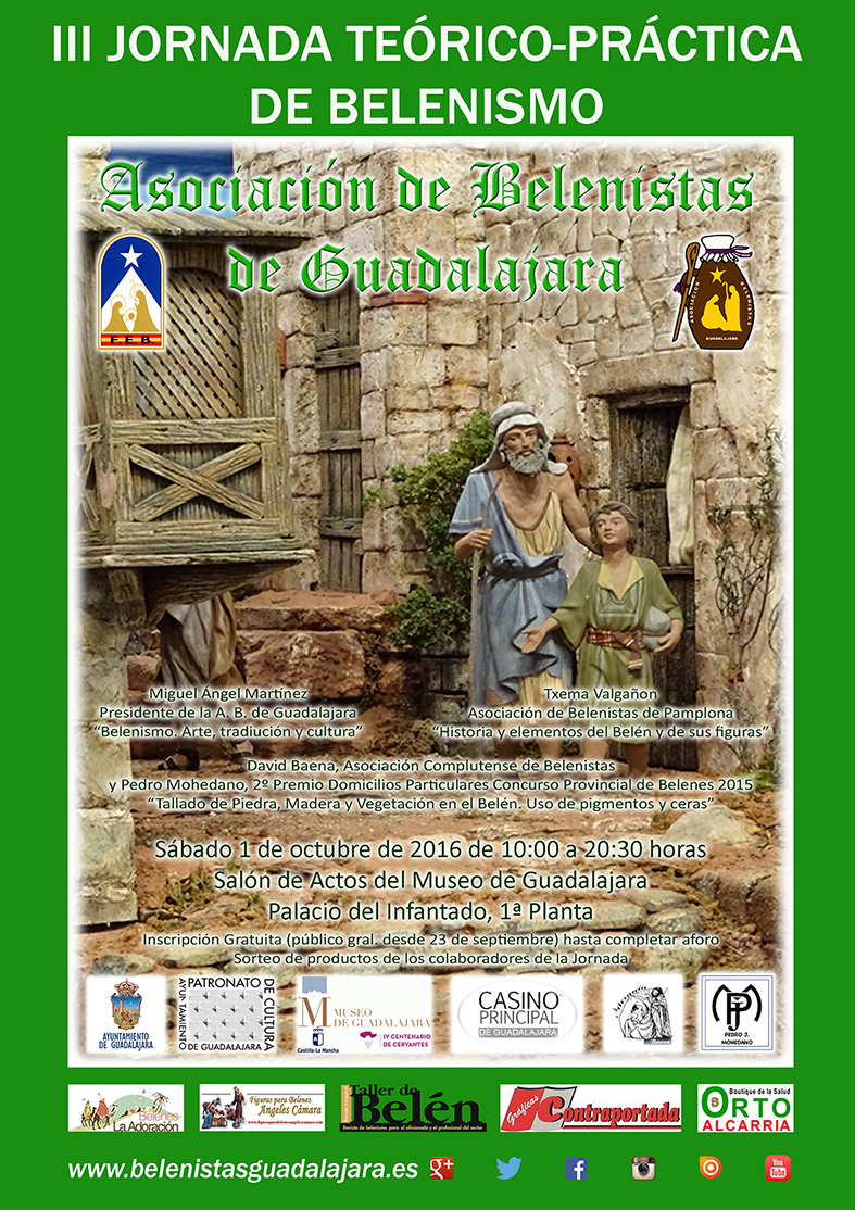 Para esta ocasión, la misma se celebrará durante todo ese día en el Salón de Actos del Museo Provincial (Palacio del Infantado), en la primera planta del mismo, contiguo a la sala Azul, de exposiciones temporales. Por la mañana, abrirá la Jornada nuestro presidente con una ponencia centrada en el mundo belenista como arte y tradición y su correspondiente movimiento asociativo con las peculiaridades que las mismas, como asociaciones culturales, atesoran. Continuará Txema Valgañón, de la Asociación de Belenistas de Pamplona, quien presentará la historia del Belén como representación artística, las características propias del mismo. También nos hablará de las figuras del Belén, de sus significados y los artesanos y estilos más representativos de la imaginería navideña. La jornada de tarde se centrará en la explicación práctica de nuevas técnicas de pintado, tallado y, en general, de creación de construcciones y elementos realistas del Belén. Esta ponencia será impartida por David Baena (Asociación Complutense de Belenistas, Paso a Paso en el mundo del Belenismo) y Pedro Mohedano, de El Casar (2º premio del Concurso Provincial de Belenes 2015 en la categoría de Domicilios Particulares y Trofeo Navidad en el año 2014).