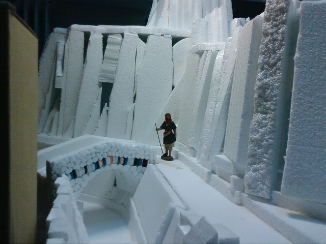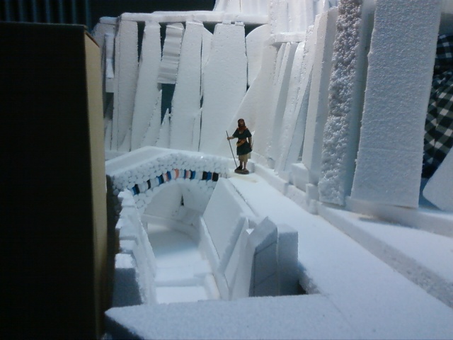 Ahora tendremos que “currarnos” rematar las orillas, fabricando unas laderas hasta la altura del suelo de nuestro belén. En mi caso ese nivel coincidirá con el paso del puente. Lógicamente el depósito y el cauce, estarán por debajo del nivel del suelo de nuestro belén.