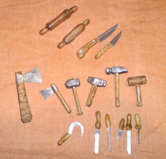 Hola les presento algunas miniaturas de carpinteria ya que pondre a José de Carpintero y de cocina cuchillos y rodillo, realizadas viendo sus albumes y post.