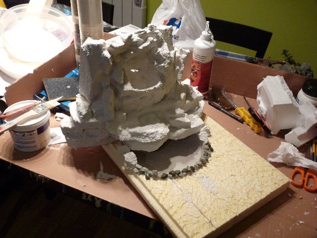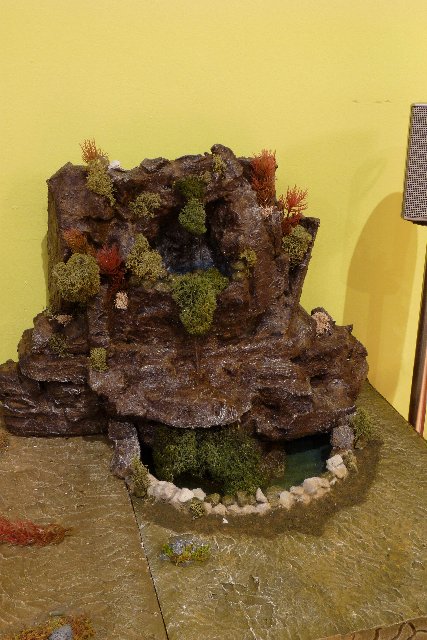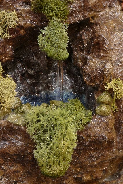 En cuanto a las plantas, es una especie de musgo decorativo que venden estas fechas en el Alcampo, la verdad es que es muy curioso, porque tal y como viene es blandito, pero en cuanto se moja y luego se seca se pone duro, aunque luego se vuelve a reblandecer con el agua, vamos que como lo mojes no vuelve a su estado orginal. Y las de color marrón son plantas de plástico de las que venden para acuarios.