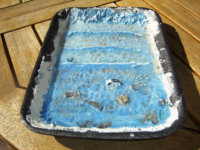 Cuando la masa está mordiente y se puede trabajar bien sin que se vaya pegada al utensilio que vayamos a usar, procedemos a marcar lo que sería el fondo arenoso para que después nos facilite el imitar con la pintura lo que sería el reflejo del sol sobre éste. En este primer intento he usado un punzón de punta redonda, pero pienso que quedaría mejor si se hiciera una especia de esponjeado usando una bola hecha con una bolsa de plástico o papel albal, y dejando marcada la rugosidad que deja ésta sobre la superficie (ahora mismo estoy haciendo un segundo intento de esta forma y cuando lo tenga pongo el resultado para comparar, pero vamos a lo que vamos.). Se pegan también las piedrecitas, plantas, conchas ... o lo que queramos que se vea como si estuviera en el fondo. Hay que tener en cuenta que cuando echemos el agua artificial no se cubrirá mucha altura, por lo que hay que usar piedras casi planas para que hagan el efecto y no sobresalgan. Otra opción es usar la misma masa para hacer las piedras y después pintarlas para crear el efecto que se desee.