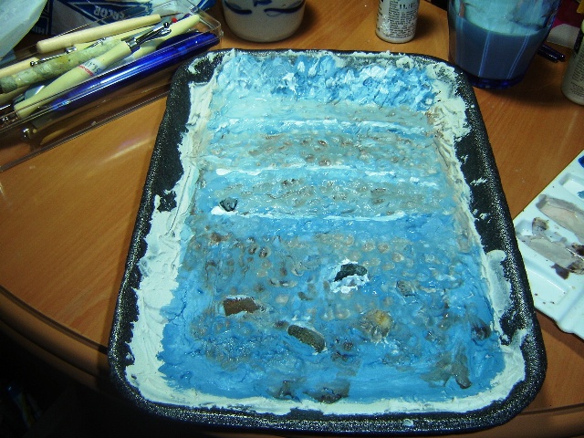 Tras mucho mirar en el foro (sobre todo en el apartado dedicado al agua donde hay un post de Paizga muy interesante donde habla sobre diversos productos para hacer el agua de forma artificial), ver las ideas que daban otros compañeros sobre el uso de agua artificial y demás para hacer fuentes y ríos y mirar en muchos foros sobre miniaturas y modelismo me decidí a hacer mi mar sin agua real. En primer lugar pensé en usar la resina de dos componentes que aconsejaba Paizga (también llamada resina para oclusiones o inclusiones, que es la que se usa para hacer los llaveros éstos que llevan bichitos o florecitas dentro) porque la cosa saldría más barata., pero tras mucho pensarlo y preguntar por ahí en primer lugar no la encontraba en ninguna tienda cercana y en segundo y más importante, no me atreví a usarla porque es un producto tóxico por inhalación que hay que saber manejar, produce calor al fraguar, por lo que hay que tener cuidado con la masa que se usa como base ya que debe resistir el calor, (en uno de los foros donde entré a un forero se le había resquebrajado la escayola al fraguar la resina) etc. etc. ... Pero aquí lo dejo dicho por si algún valiente se atreve y quiere usar la resina en lugar de los productos para agua artificial que son menos tóxicos pero también más caros.