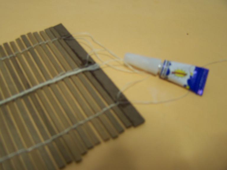 Materiales; un listón plano, un listón plano de un medida mayor que la anterior, cuerda o hilo de dos grosores, tijeras, pegamento de contacto y paciencia.