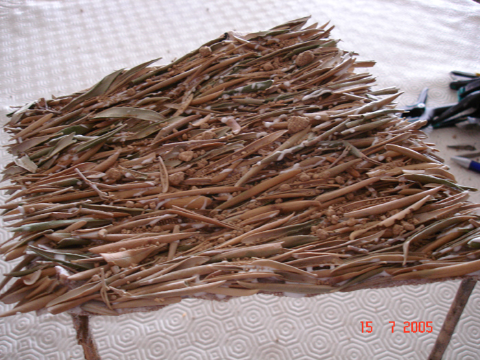 El sombrajo está hecho con una lona, la consabida cola blanca y hojas de olivo secas encima, mezclado con arena para darle consistencia. No tan lejos de como debió ser. Para que no haya duda ahí tienes una foto de cerca durante la construcción del sombrajo.