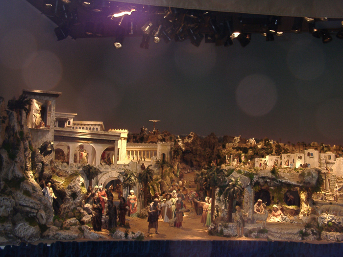 La cueva o construcción donde se encuentra la sagrada familia, no aparece  al principio del visionado al estar tapada por una pared de “una casa”. En el momento conveniente esta pared “desaparece” y se enciende el Nacimiento en todo su esplendor. Ver el Nacimiento de Mayo, bien conocido en: