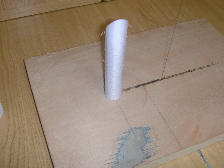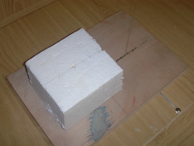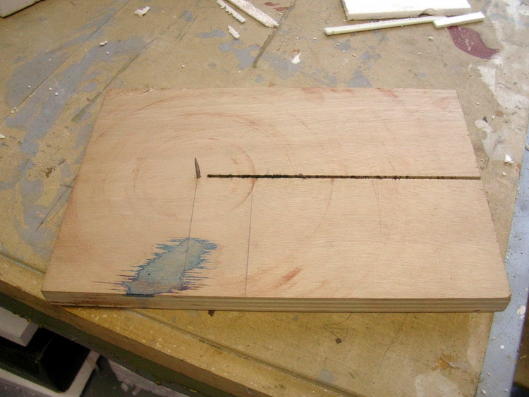 El util, como vereis es una tabla con un clavo y una ranuera hasta el para pasar el hilo de la cortadora (vertical) (foto 1)