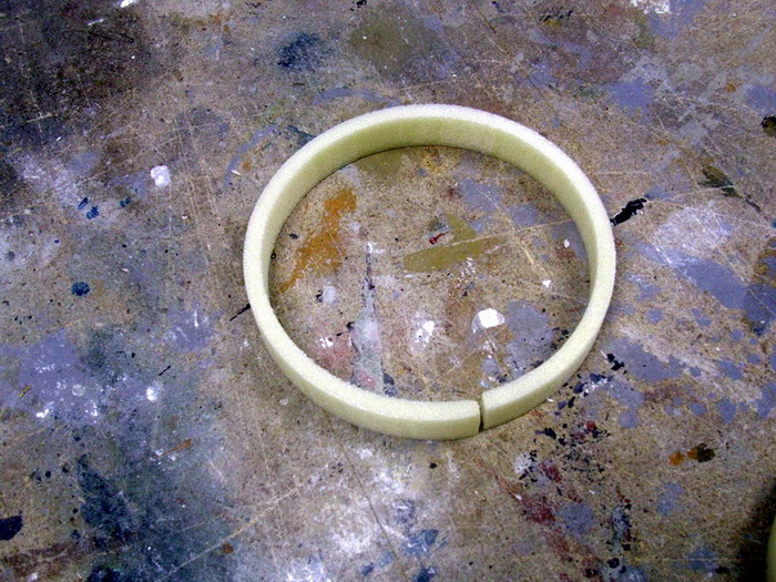4º Encendemos la maquina y desplazamos el util con la pieza hasta la primera marca (diámetro exterior); en ese punto comenzamos a girar lentamente la pieza de porex manteniendo fijo el util.; Desplazamos nuevamente todo hasta la segunda marca y cortamos el díámetro interior.(fotos 5 y 6)