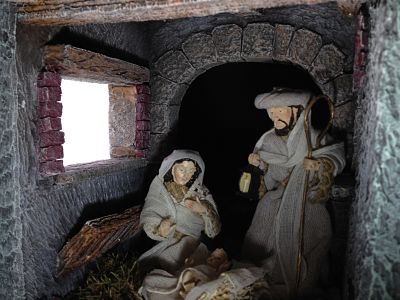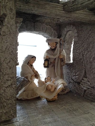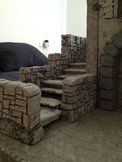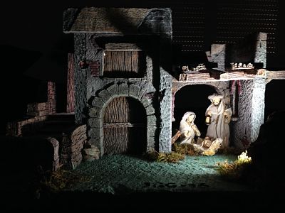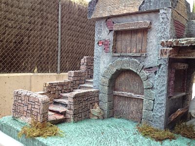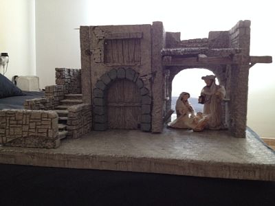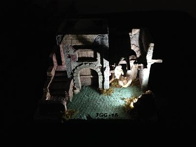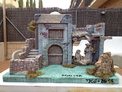 os pongo el resultado de un centro de 50cmx50cm de nacimiento para la entrada realizado con porex extruido y a escala para figuras de 12cm hecho con cutter y soldador electr.(30w) con regulador para disminuir la potencia y pintado con pintura acrílica , estilo veladuras y con instalación de dos bombillas led (luz fría) de 2.3w .