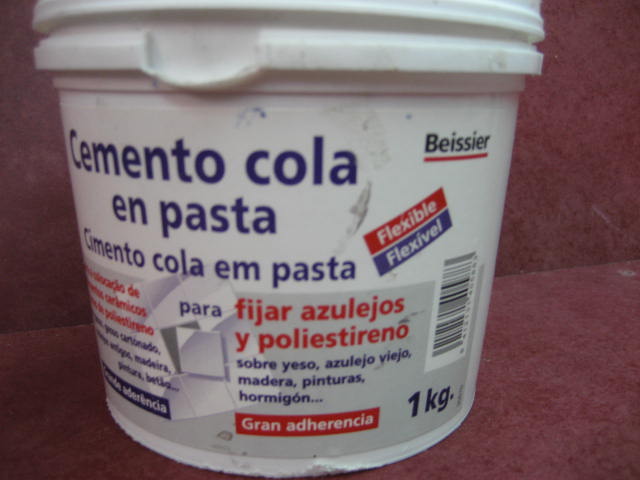 Mi recomendación personal es que se utilice cualquiera de las anteriores recomendadas por nuestros compañeros, o el simple cemento cola que es más fácil de encontrar pues puede comprarse en grandes superficies de bricolaje o entiendas de pintura y ferreterias.
