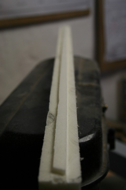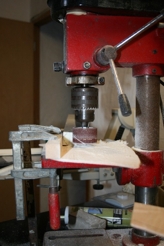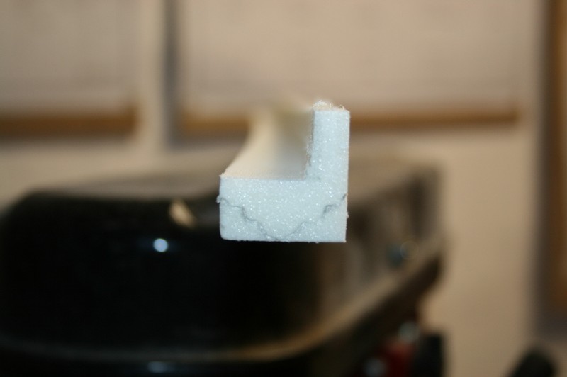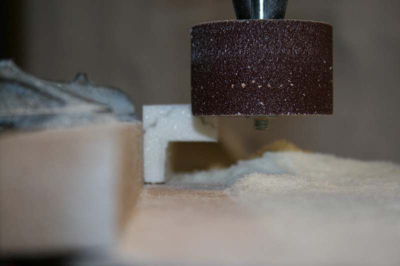 2ª - Con maquina y tambor de lijar(para los umbrales de las puertas de la ermita): Corto las tiras de porex a la medida(corto de manera que tenga suficiente ancho y alto para encajar en el hueco en forma de L y para hacer las formas).Despes en un tablero,hago la plantilla de las formas para comprovar( foto6.) y quito(pasar por el bombo lijador) lo que sera la L para encajar.( fotos 6 ,7 y 8)).Despues empiezo a debastar lo que seran las diferentes molduras,ajustanto la altura y profundidad(en mi caso del taladro de banco)deseadas( fotos 9 y 10).Despues de tener todas las pasadas hechos (foto 11) solo queda redondear los cantos (foto 12).Y si el arco no es muy pronunciado,se puede pegar toda la tira entera sin romperse y solo faltara marcar con lapiz las diferntes piedras.