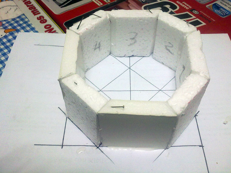 FOTO 1:Sobre un papel dibujamos el exterior de la fuente con la forma que deseemos, a continuación con porex construimos la forma.