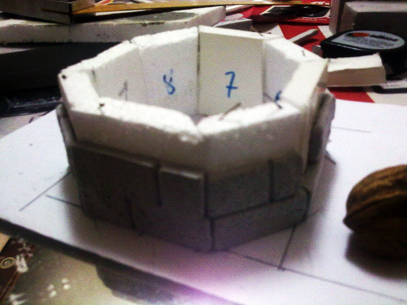 FOTO 6: Acabamos la parte superior construyendo las losas, y dandoles el mismo acabado que el resto de piedras, para la parte central de la fuente,con porex del duro he recortado un taco de 3 cm. de grosor y he cortado unas láminas de unos 3 m/m para construir los adornos, el copete superior está cortado a inglete y sacado del borde de las bandejas de alimentosluego he cortado un taquito para la parte superior, ha todo el conjunto se le ha dado el mismo acabado que al resto de la fuente,"abollado a la nuez y cepillo de alambre".