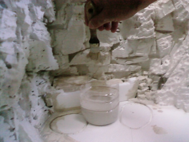 Pegado de trozos de porex sobre las paredes, de manera irregular.