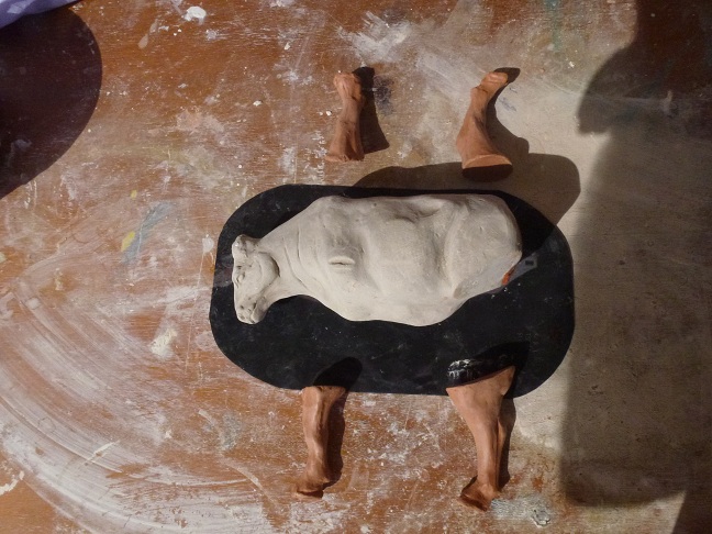 ½- Se modela la pieza lo mejor posible para luego terminarla, se le corta las orejas, cuernos y rabo, en este caso que es un buey. Se deja secar o mejor aún se cuece.